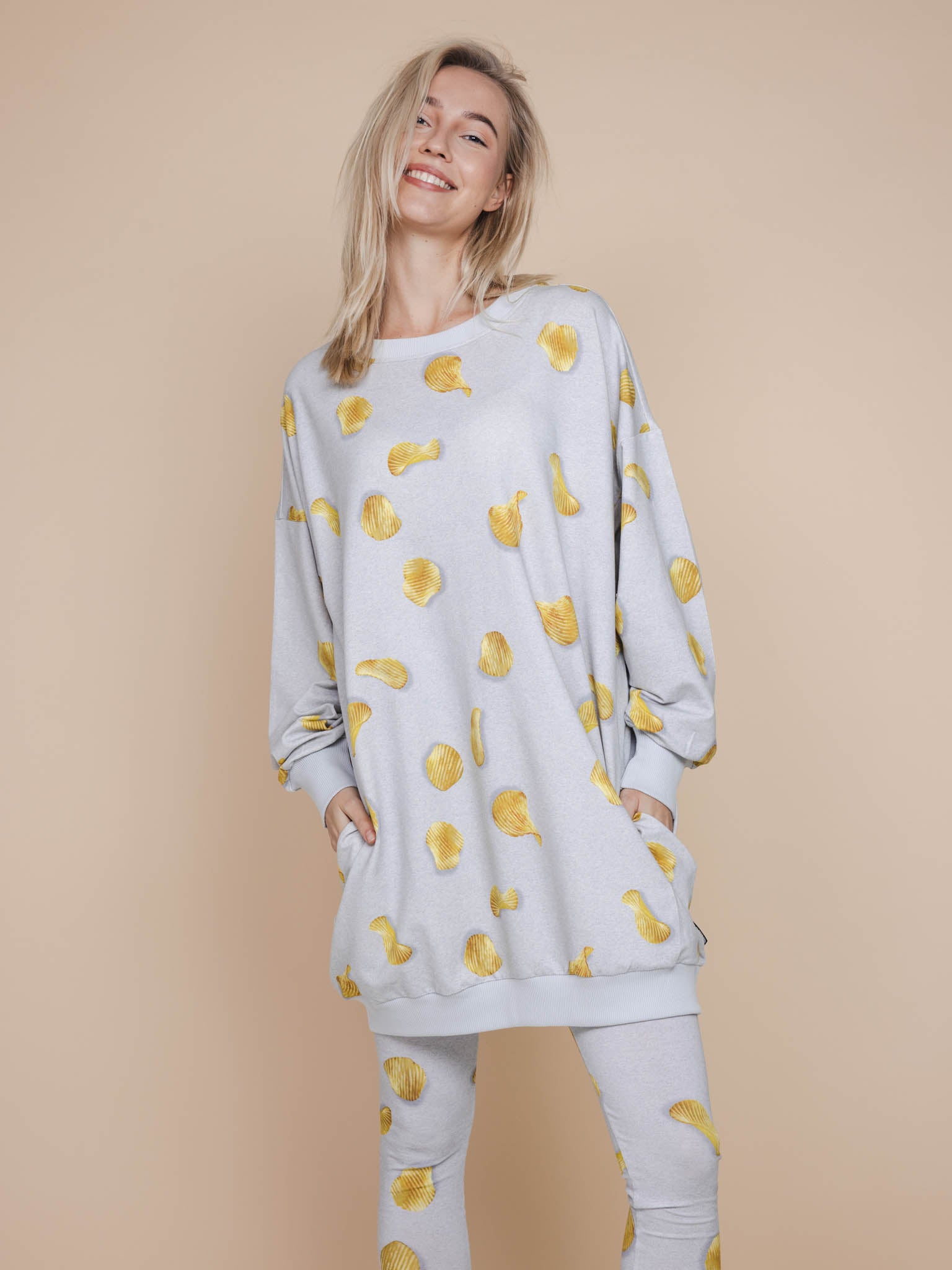 Oversized Pulloverkleid mit runden Hals, langer Ballonärmel, abgebrochener Schulter, tiefen Taschen, wunderbar in die Couch kriechen. Das set Enthält die Leggings.