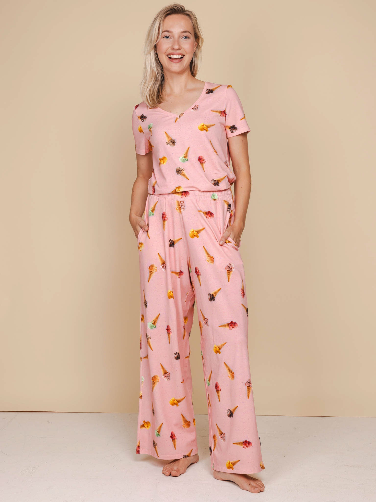 Noch Platz für ein Eis? Fünf italienische Kugeln, life-size auf deinem Shirt gestapelt. Zum Anschauen fast zu lecker. Für Hosen und Kleider gibt’s ein verspieltes Eis-Muster auf warmem Rosa. Achtung: Schmelzgefahr.