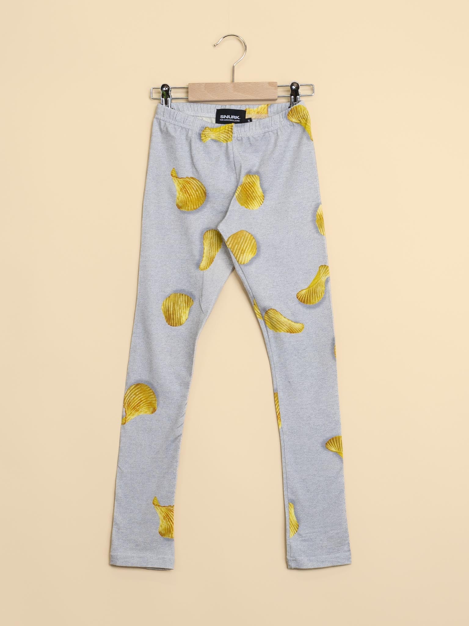 An addictive delicious all-over print of natural chips, scattered over a light gray background. Cracking fresh in our collection and surprisingly soft on your skin. Because made of organic cotton With exactly the right amount of stretch. We take comfort as seriously as our snacks.