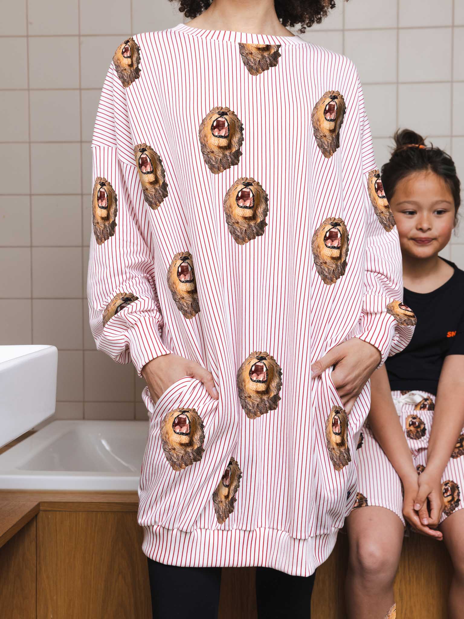 Oversized sweater dress with round neck, long balloon sleeves, dropped shoulders, deep pockets, great for curling up on the couch and perfect to combine with our leggings