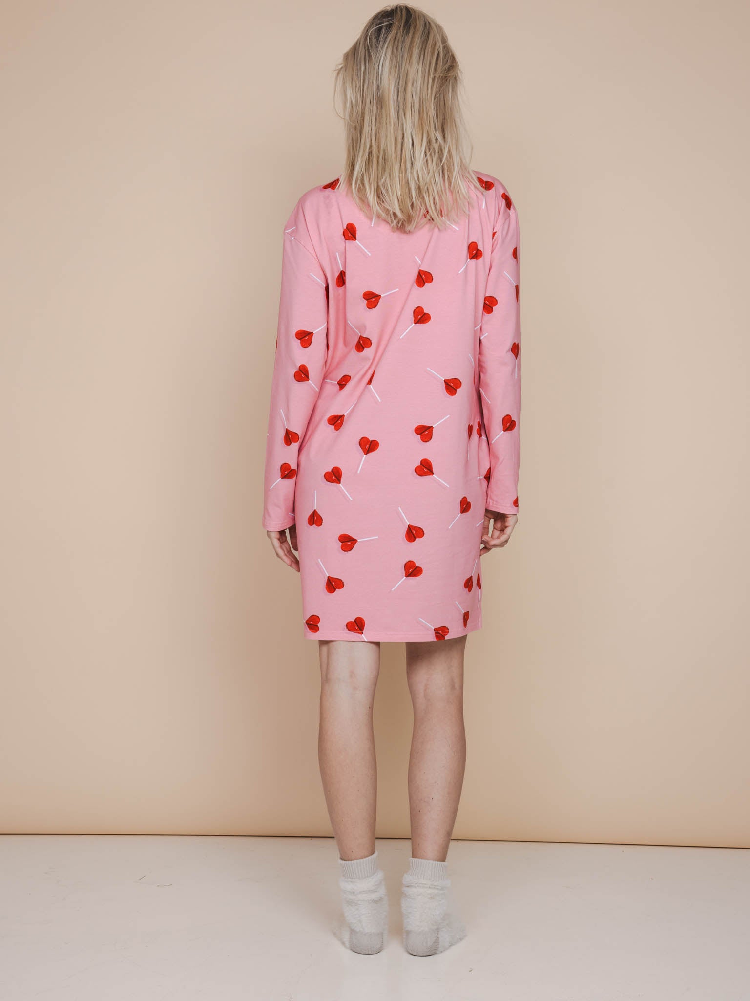 All jokes aside, this print of bright red heart lollipops on a pink background is just too much fun. Sweet, cheerful, and bursting with good vibes. Made from soft organic cotton. Whether you’re big or small, this will make every heart beat a little faster.