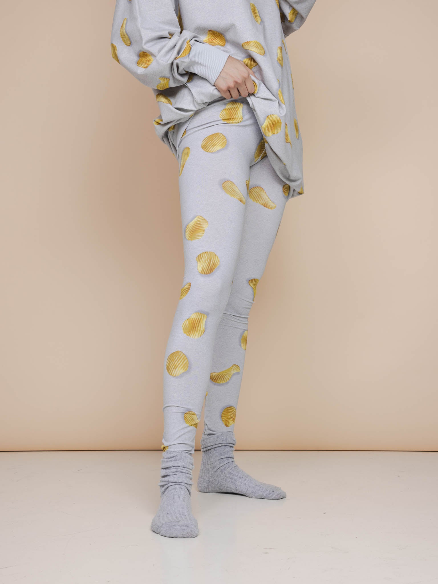 An addictive delicious all-over print of natural chips, scattered over a light gray background. Cracking fresh in our collection and surprisingly soft on your skin. Because made of organic cotton With exactly the right amount of stretch. We take comfort as seriously as our snacks.
