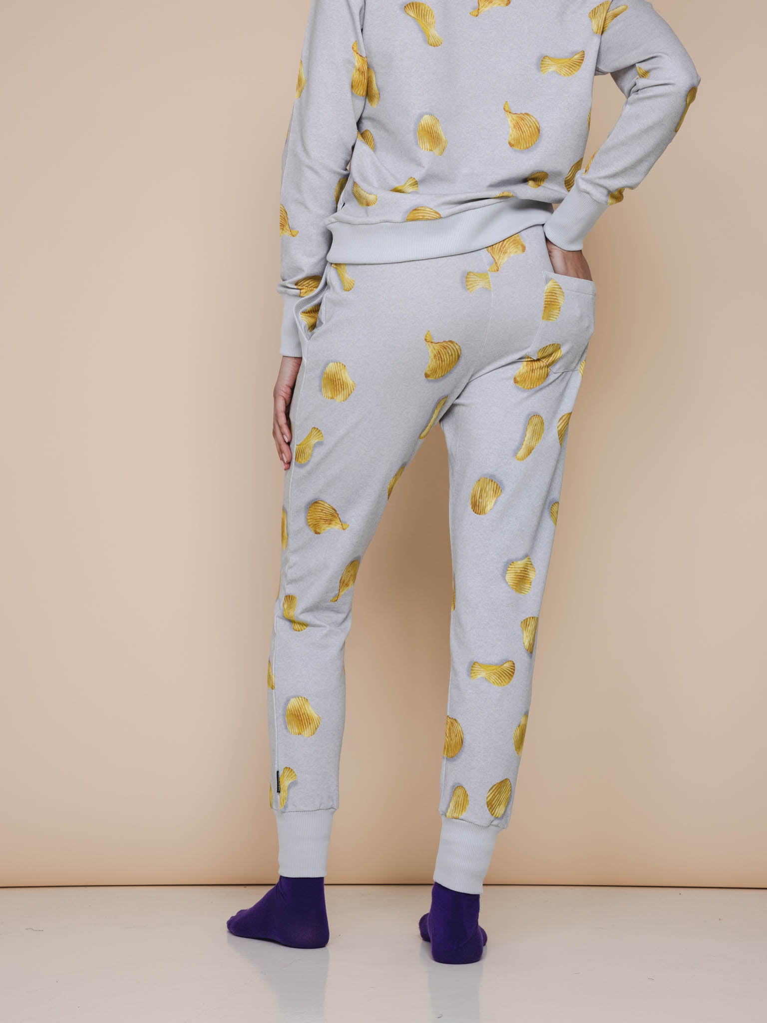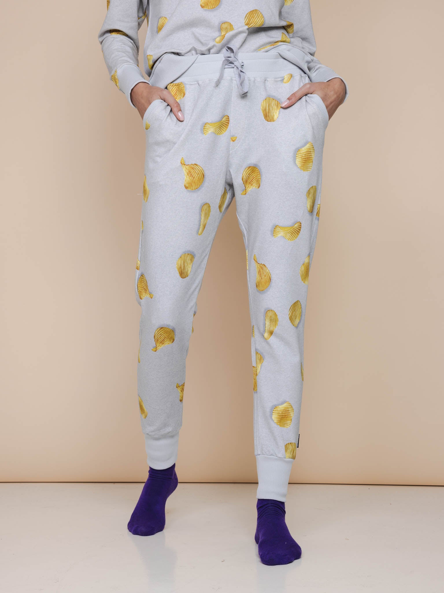 An addictive delicious all-over print of natural chips, scattered over a light gray background. Cracking fresh in our collection and surprisingly soft on your skin. Because made of organic cotton With exactly the right amount of stretch. We take comfort as seriously as our snacks.
