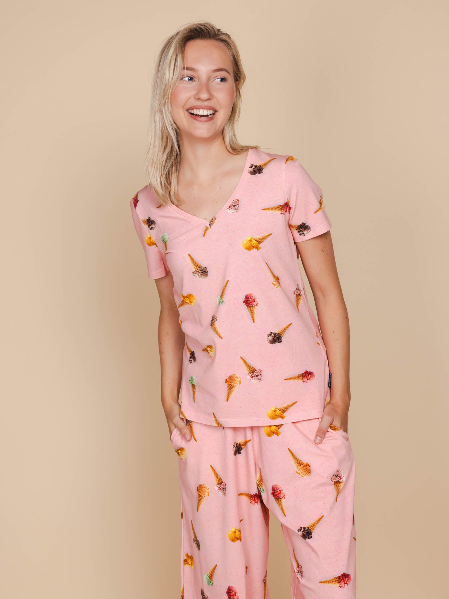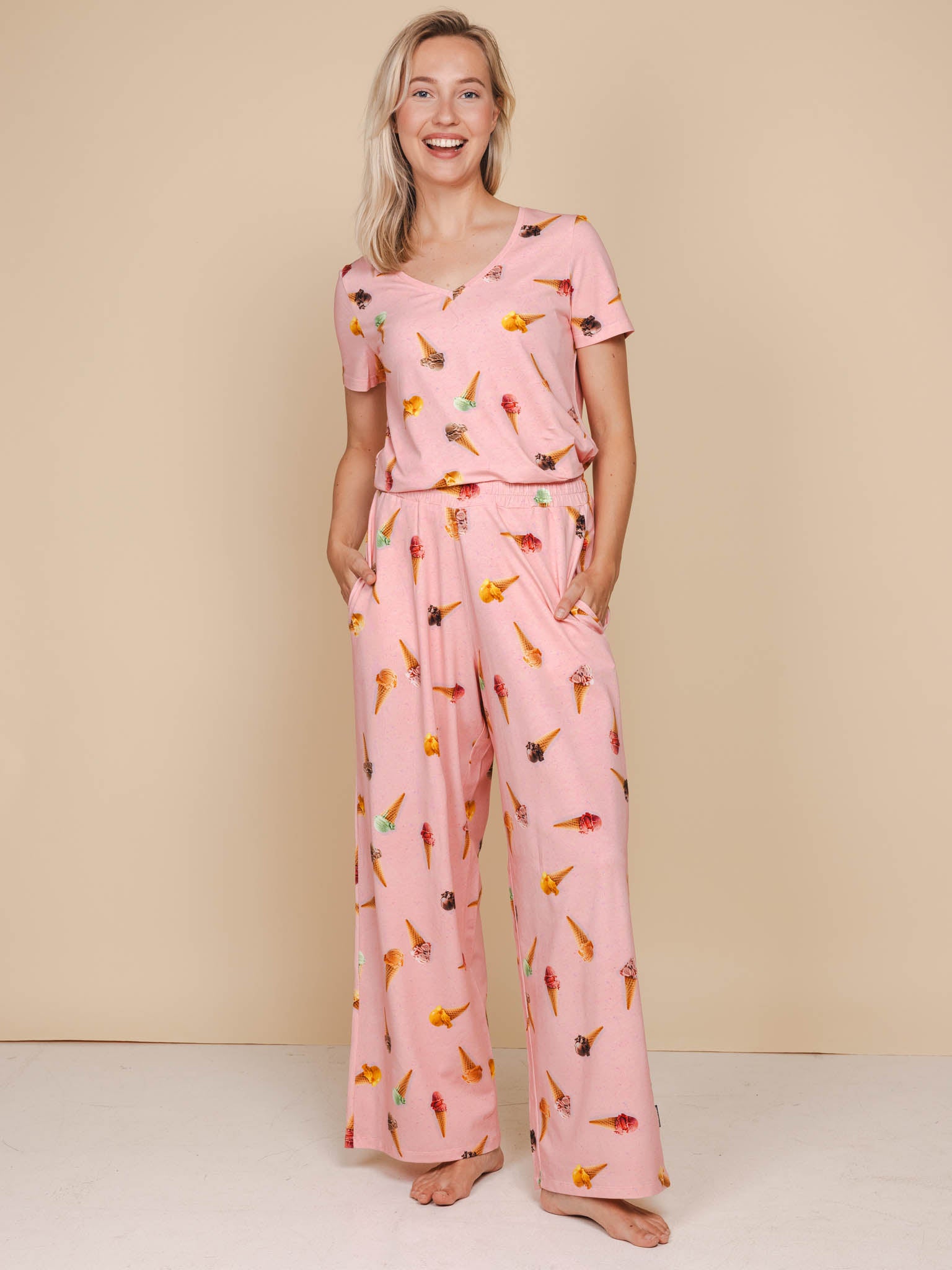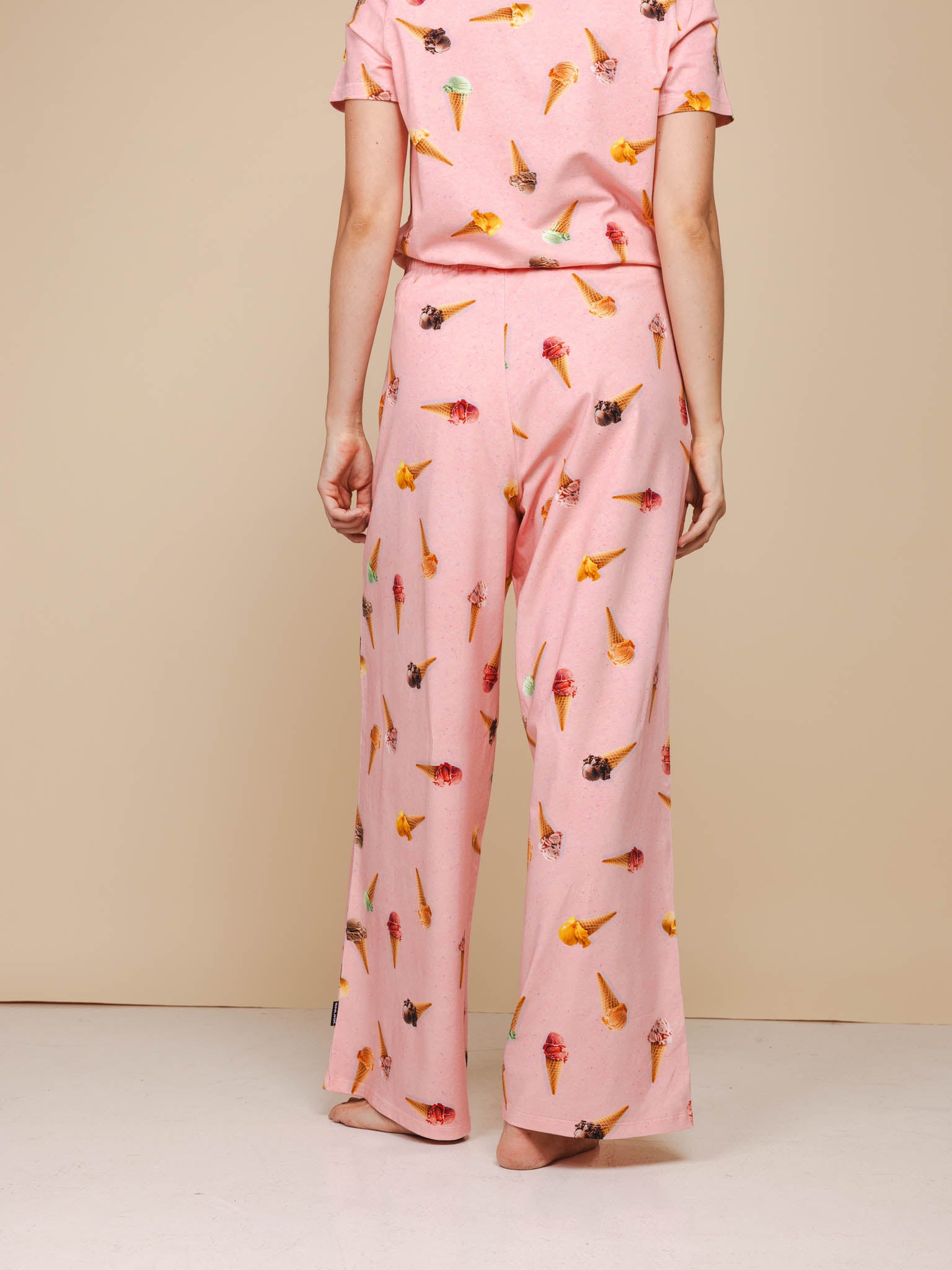Room for ice cream? Five generous Italian scoops stacked life-size on your shirt – almost good enough to taste. For trousers and dresses, we added a playful flying cone pattern on warm pink. Warning: may cause cravings.