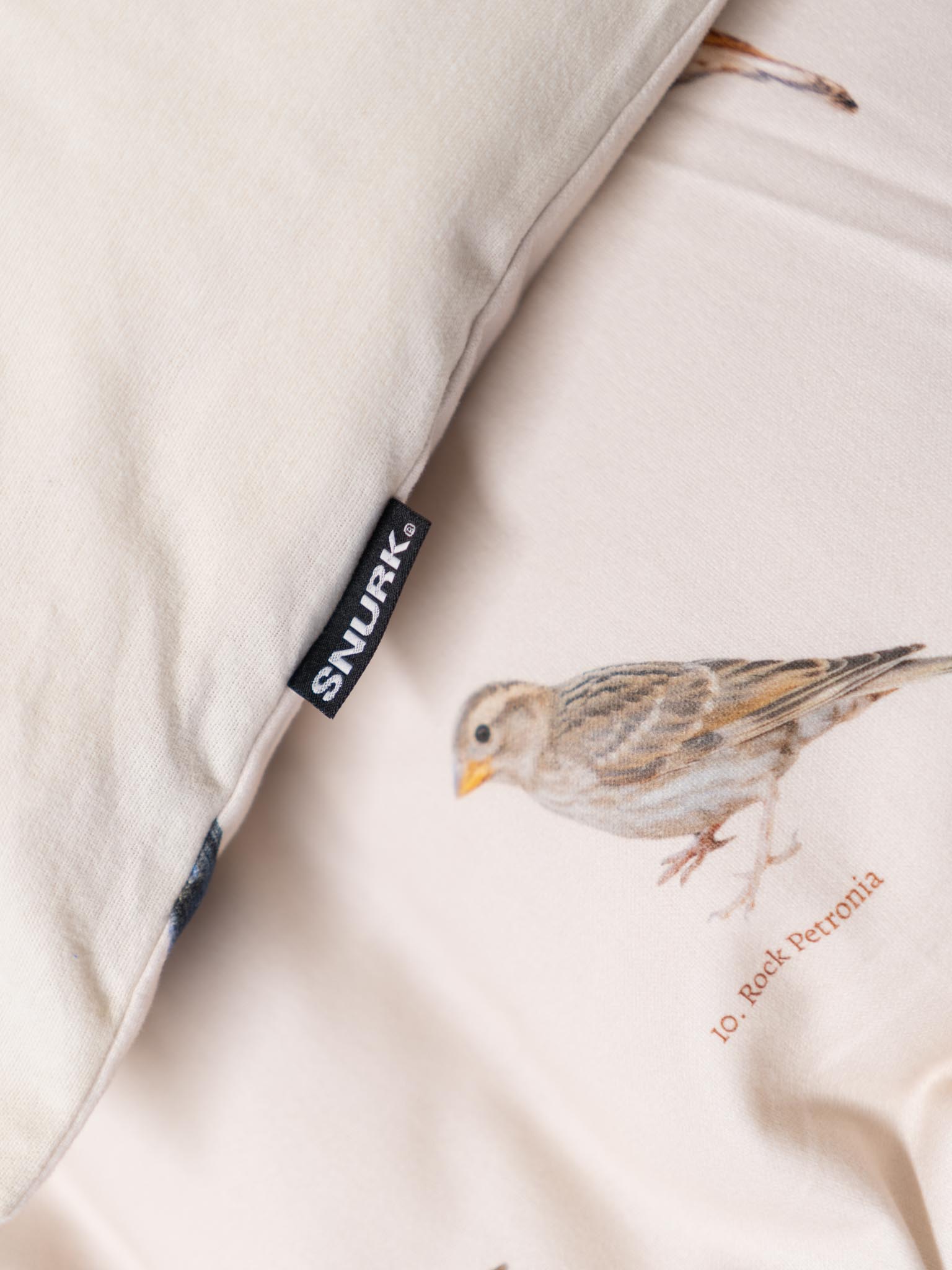 Waarom alleen vogels spotten als je er ook tussen kunt slapen? Deze print brengt de charme van een klassieke vogelposter naar je slaapkamer. Laat de rust en vrolijkheid van het buitenleven naar binnen. Het biologische katoen voelt zo heerlijk zacht, je valt misschien wel fluitend in slaap!