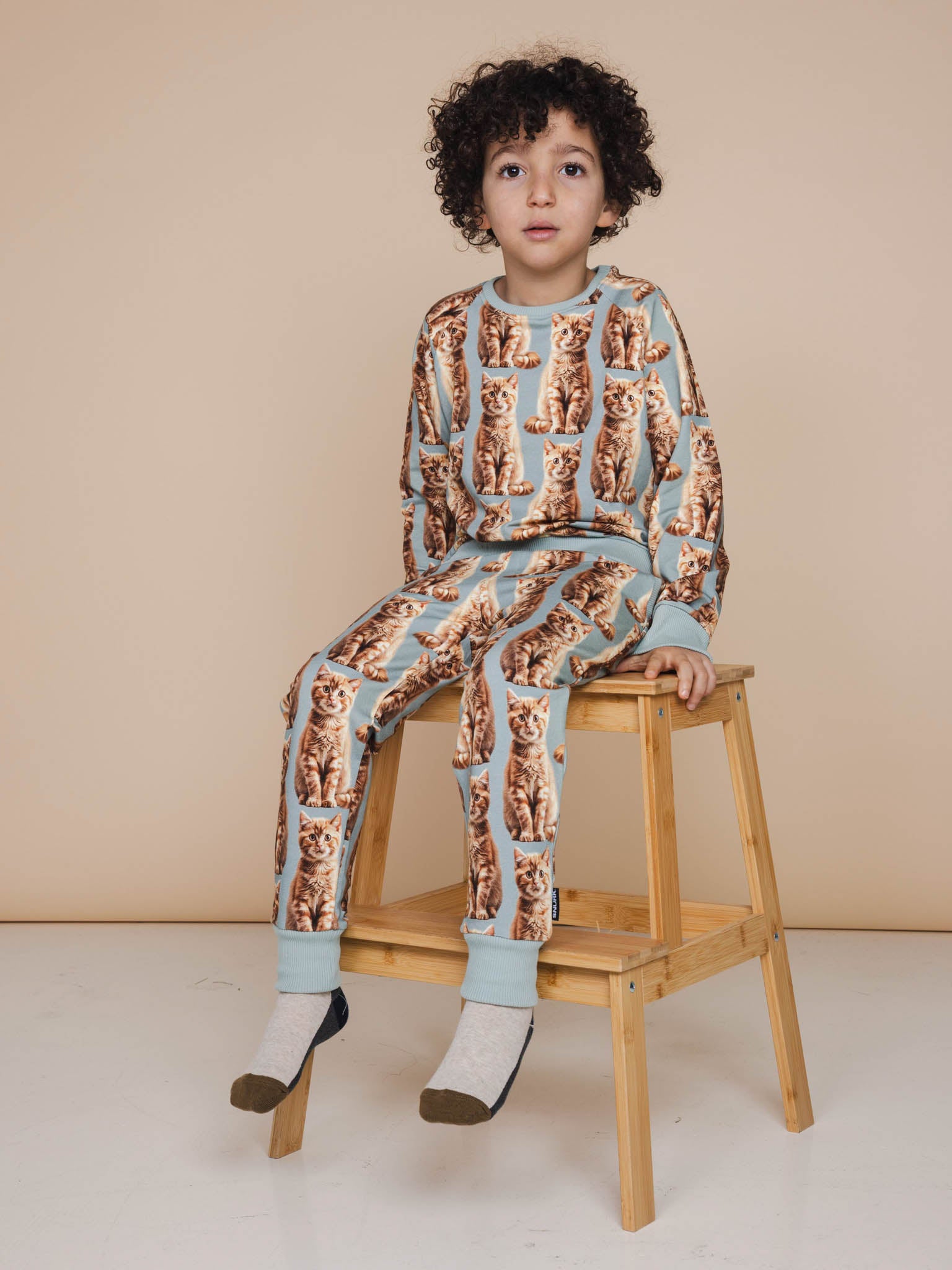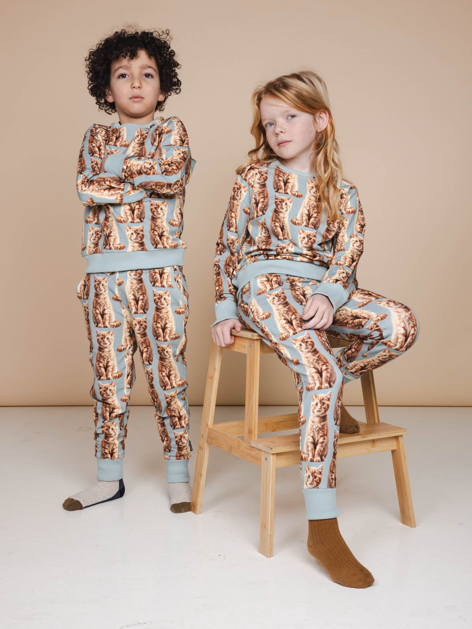 They say that cats have nine lives. Bowie Lives them all at the same time, on your pajamas. This all-over print of our red-haired cat is stubborn, charming and irresistible cuddly. Made from super soft organic stretch cotton, in a gray jade green. Prrrrrrrrijlig, right?