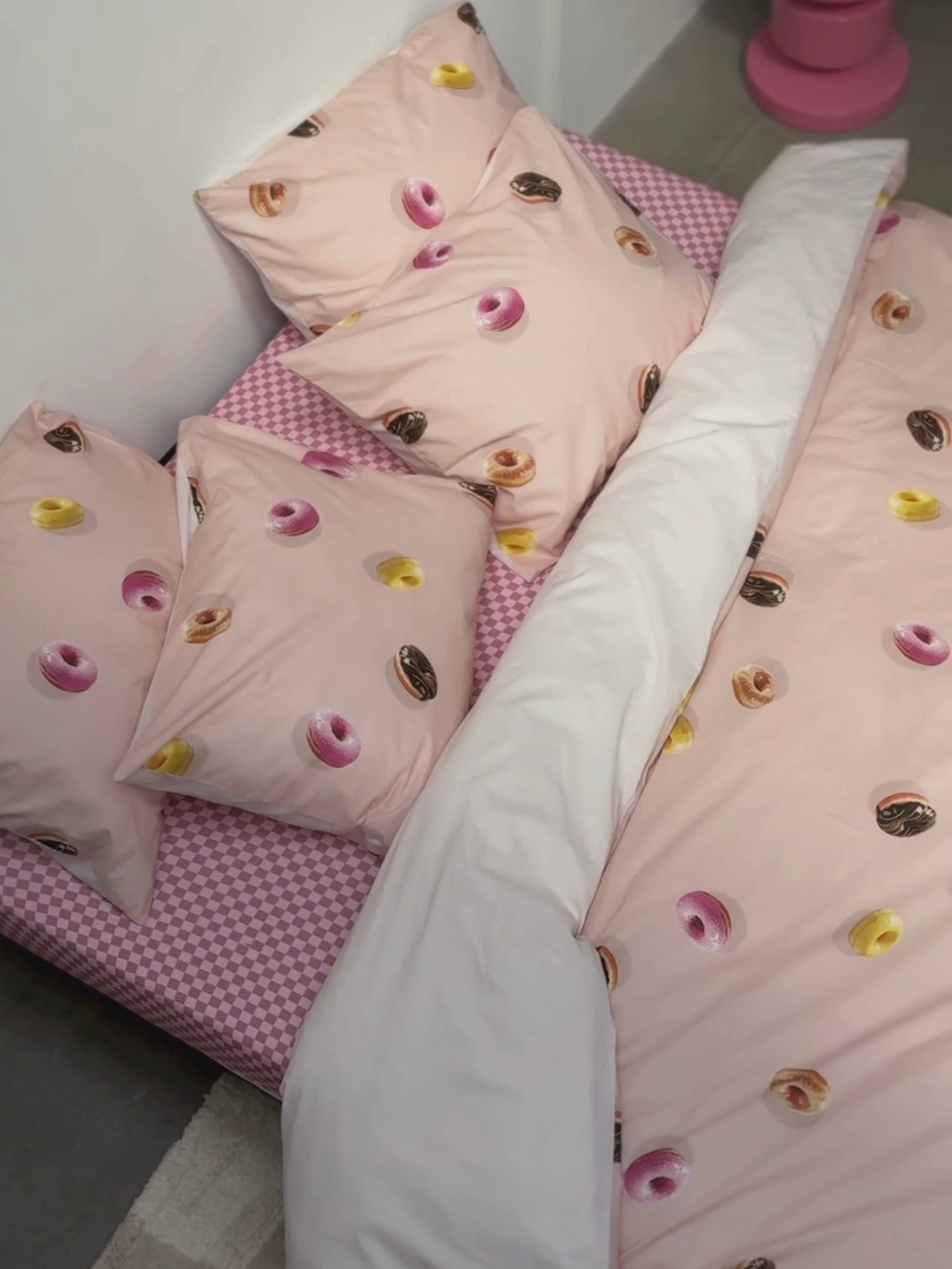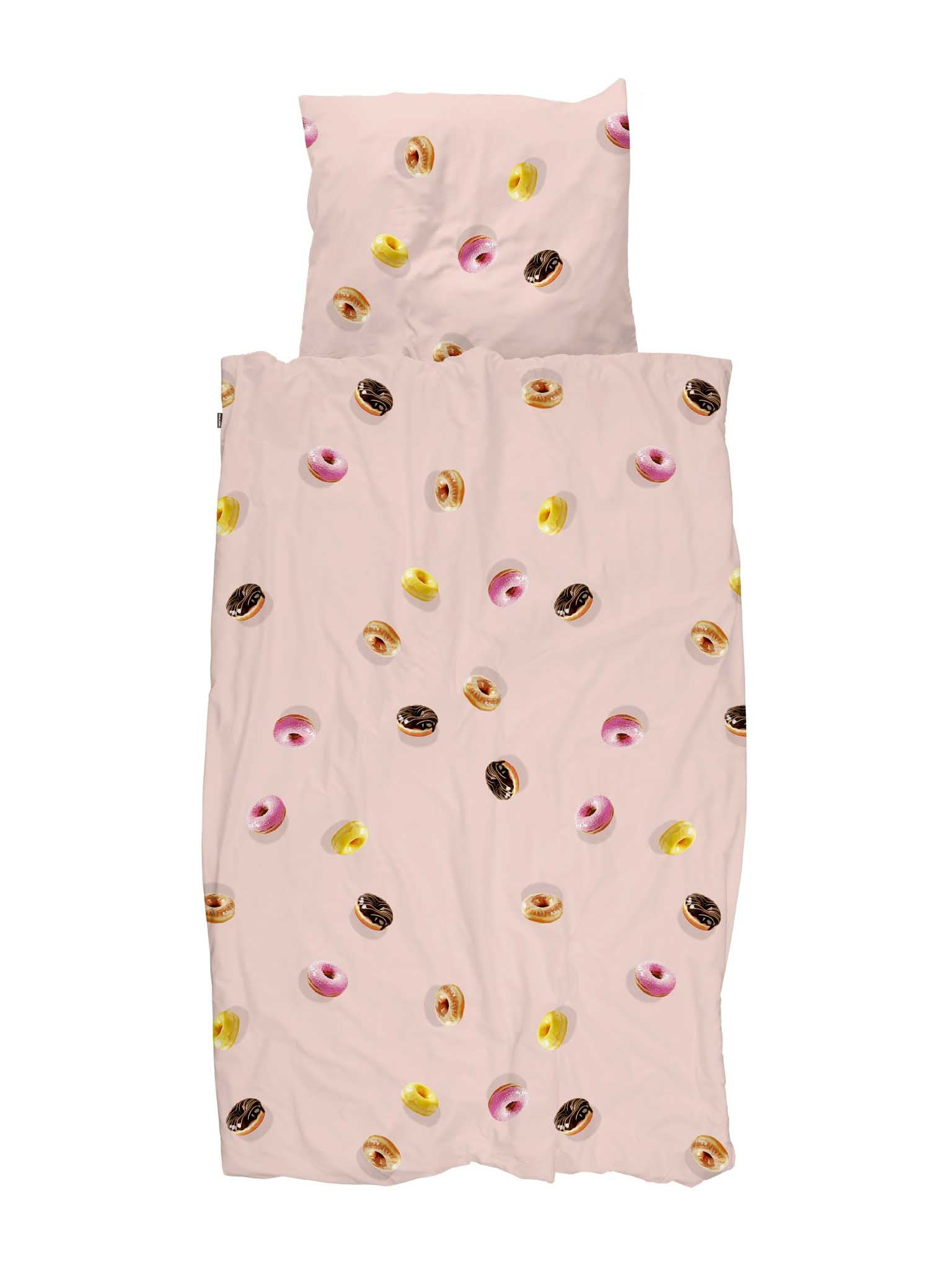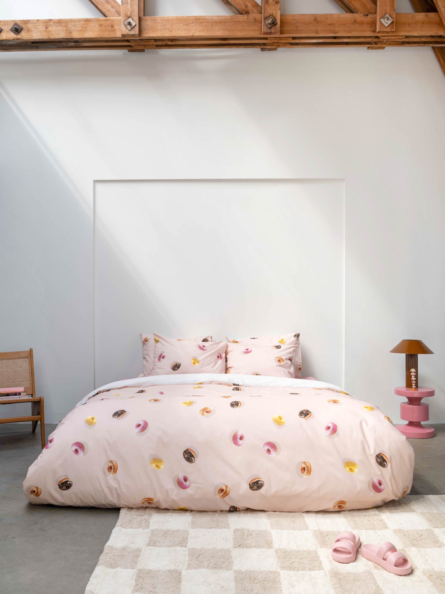 Shiny donuts in all types of glaze, spread over a light pink background. Photographed as if they have just come out of the oven, but then to crawl instead of eating. This print is soft, cheerful and seductive. Dream sweet.