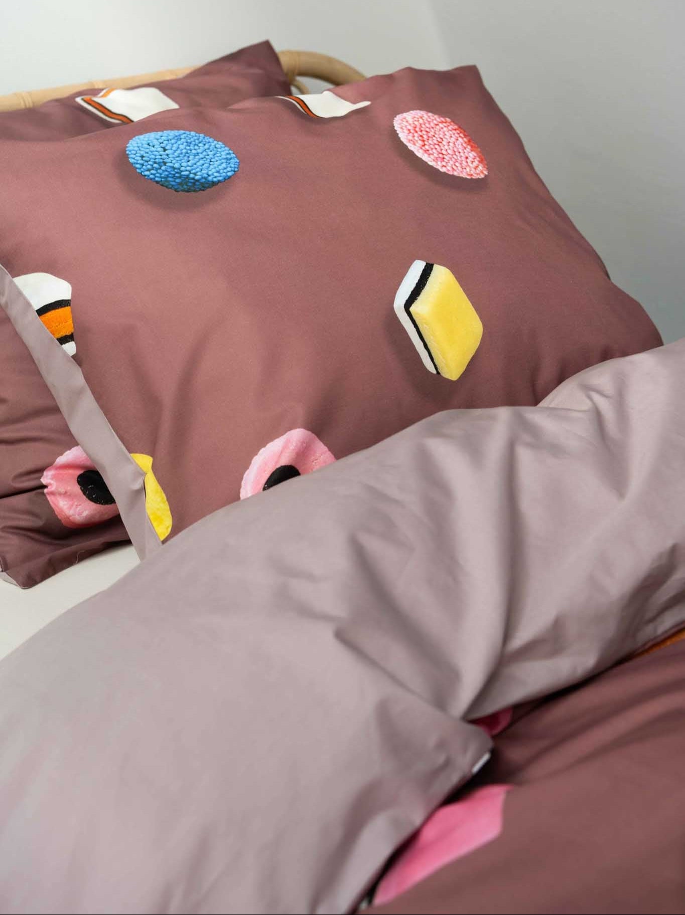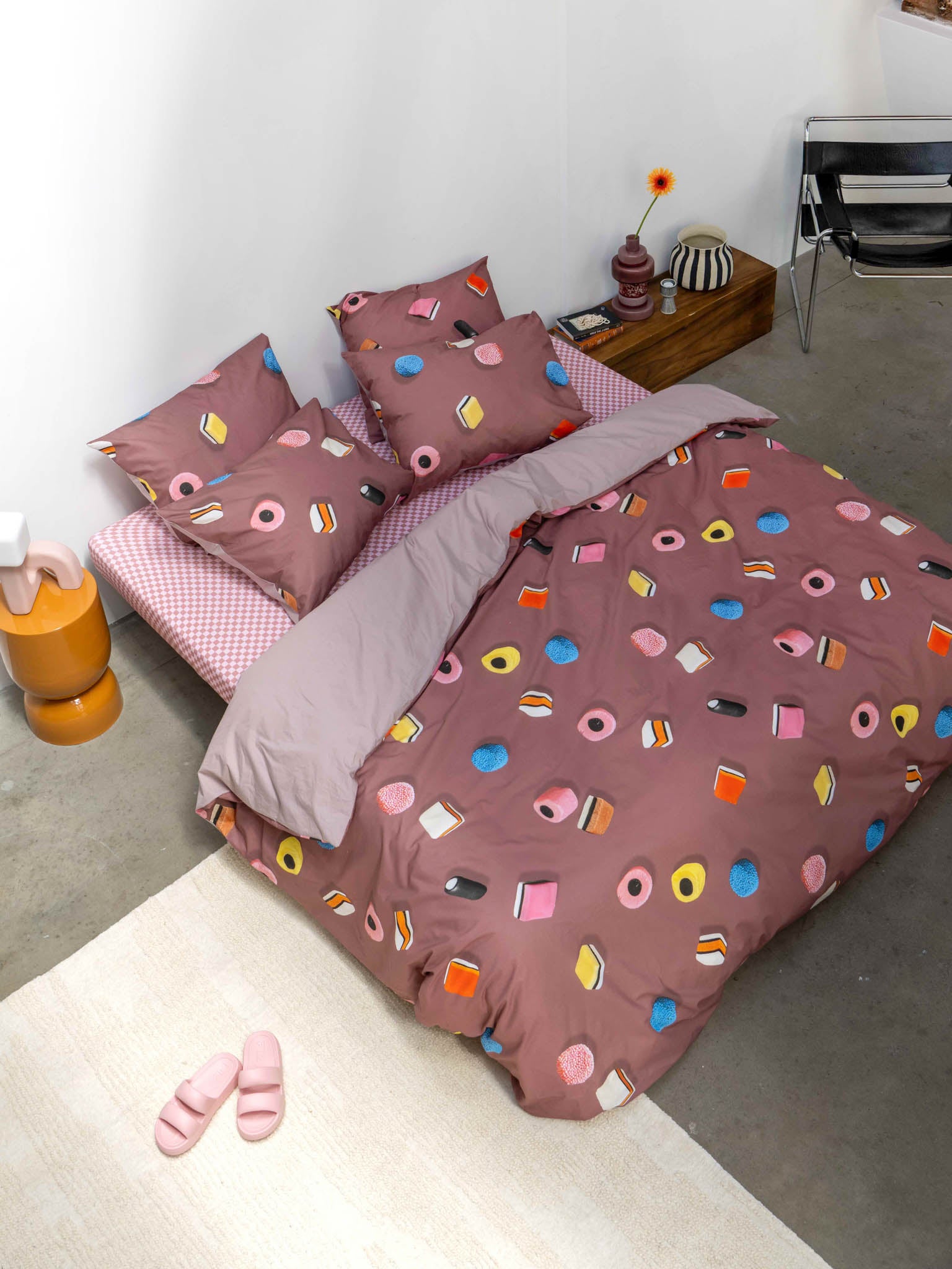 A print full of flying English liquorice sweets on a trendy mauve background. Colourful, quirky and slightly nostalgic, as if someone had tipped a candy jar onto your duvet (but in a stylish way). This special liquorice was added halfway through the season because we couldn't resist it. Please note: stocks of this liquorice are limited. Will you grab one before they're all gone?
