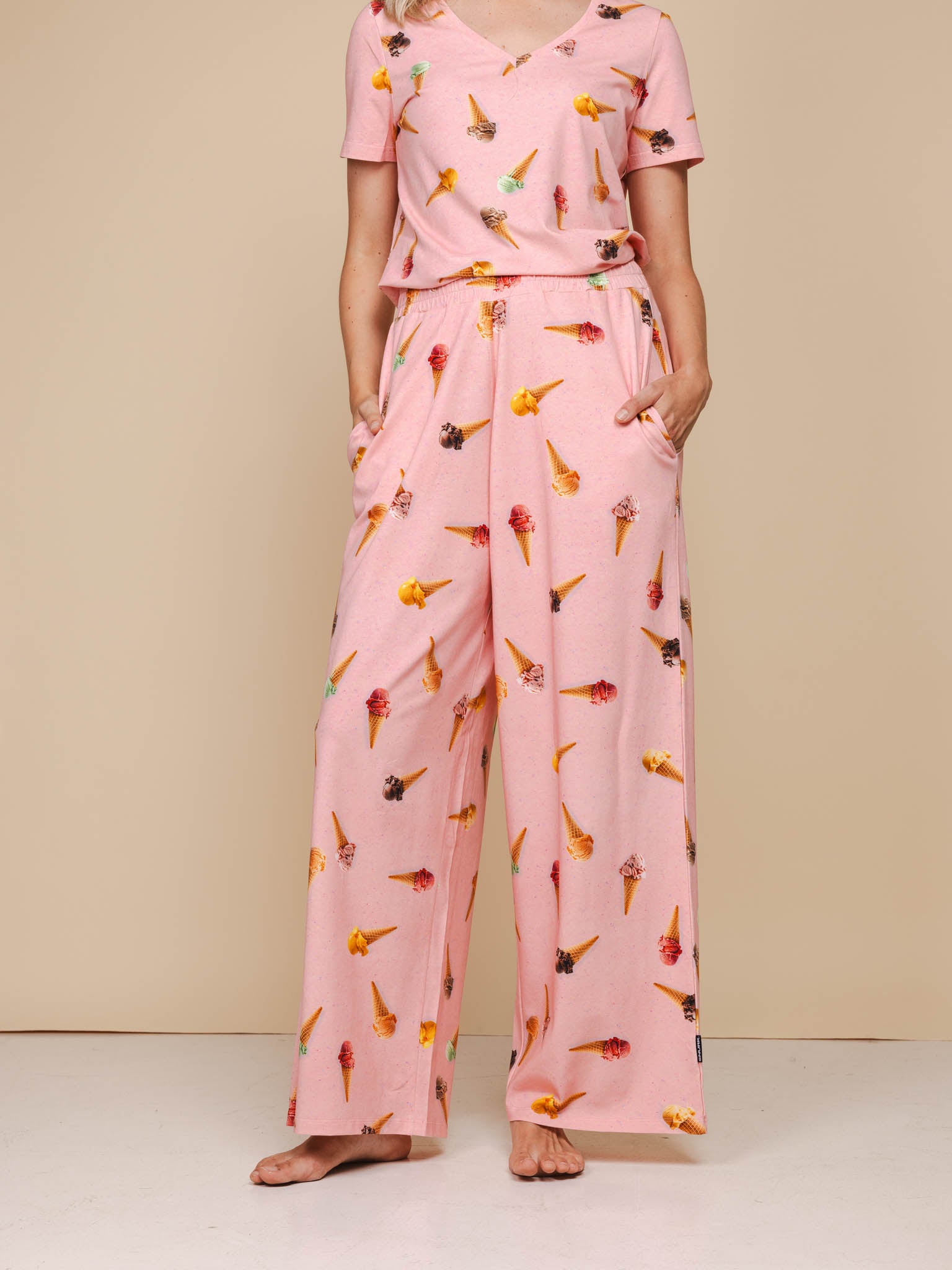 Room for ice cream? Five generous Italian scoops stacked life-size on your shirt – almost good enough to taste. For trousers and dresses, we added a playful flying cone pattern on warm pink. Warning: may cause cravings.