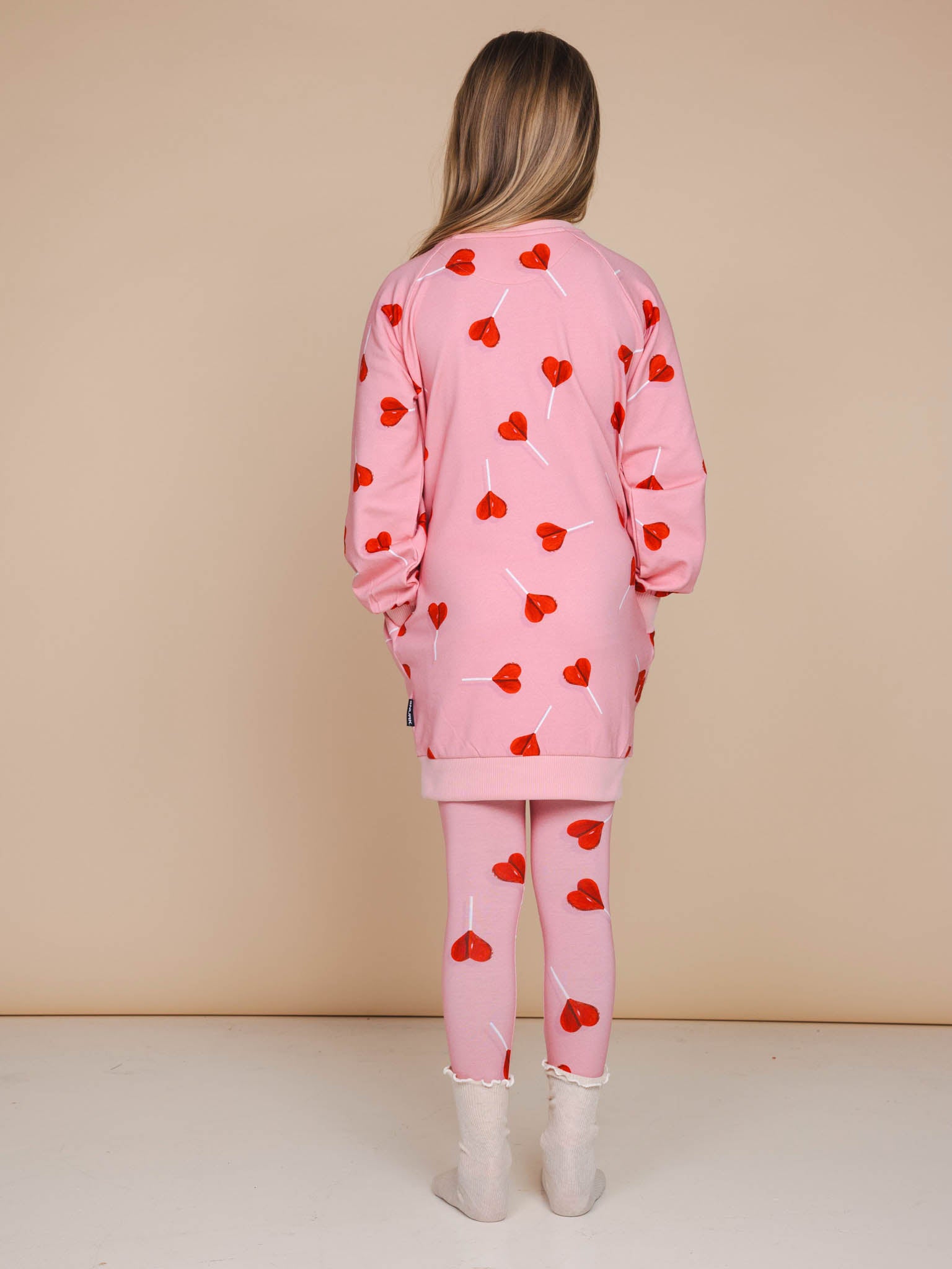 All jokes aside, this print of bright red heart lollipops on a pink background is just too much fun. Sweet, cheerful, and bursting with good vibes. Made from soft organic cotton. Whether you’re big or small, this will make every heart beat a little faster.