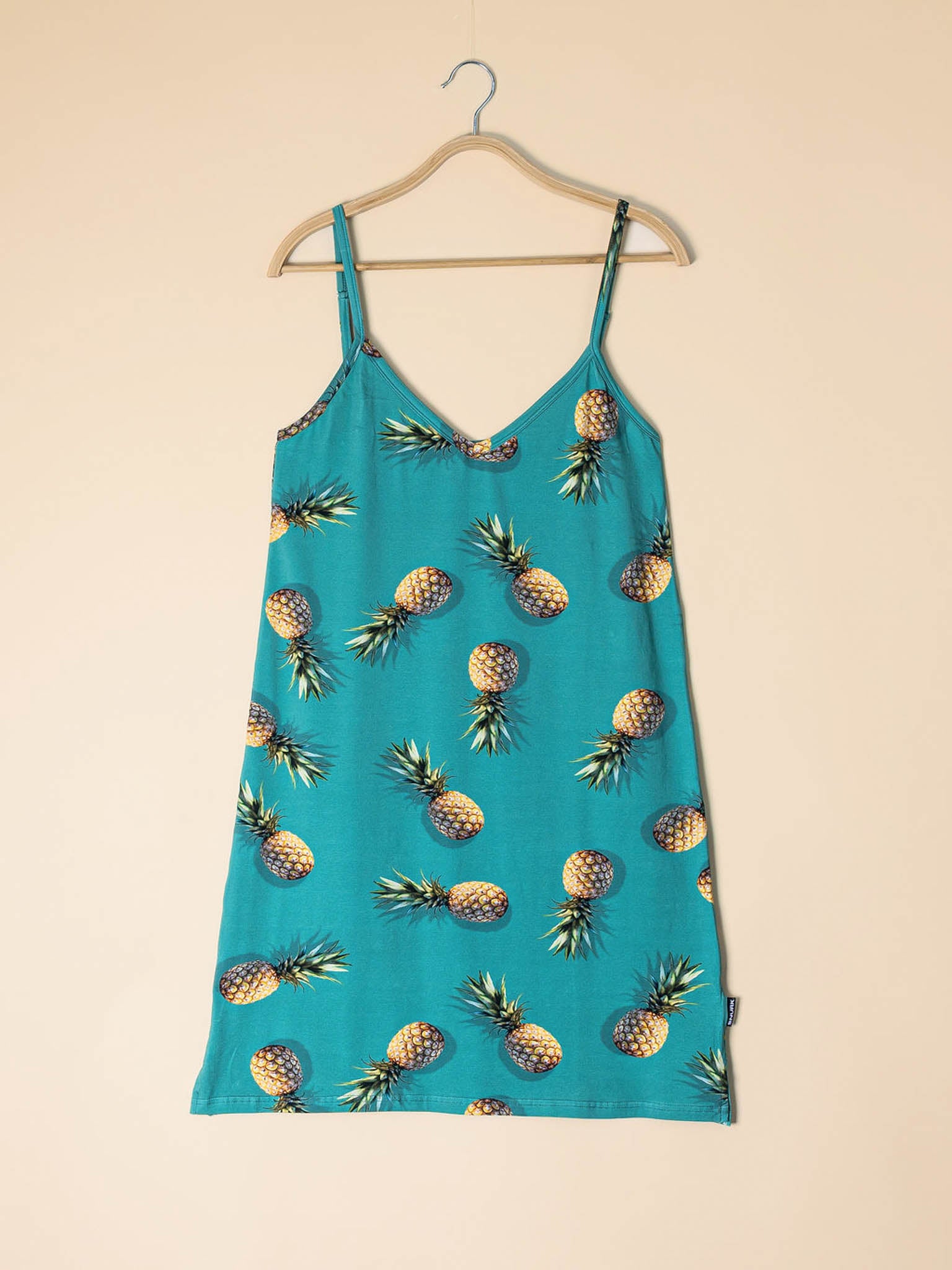 This tropical pineapple print on deep teal green is your daily hit of summer. Relaxed, comfortable and instantly holiday-ready. Slip it on, unwind – shall we light the barbecue tonight?