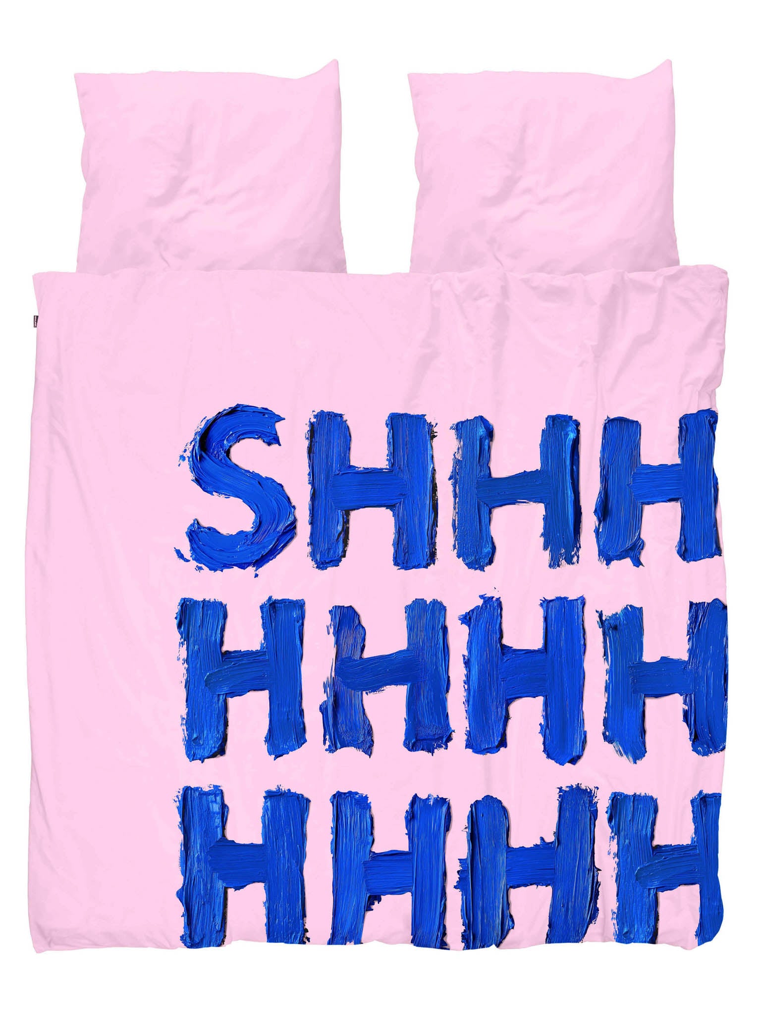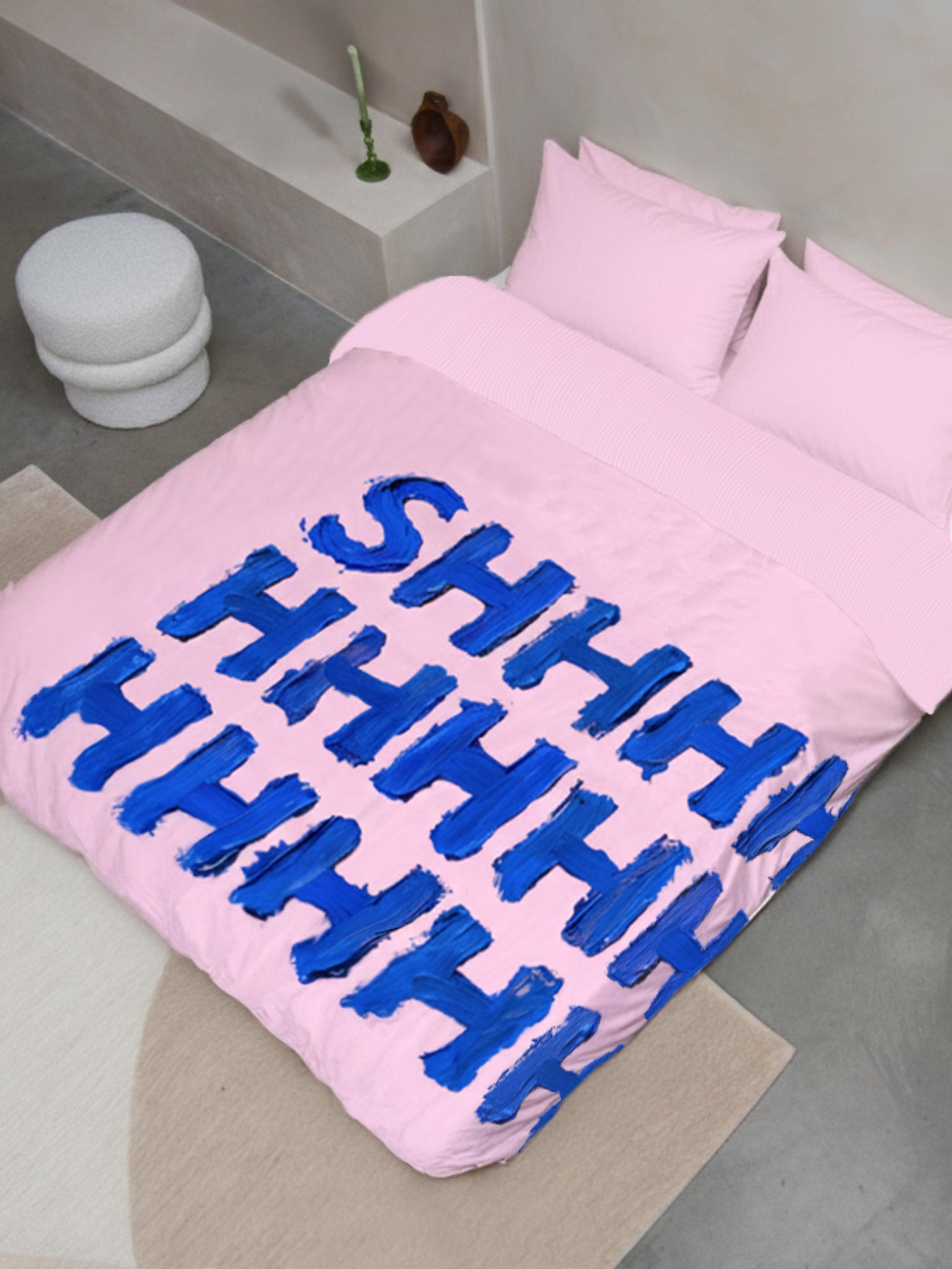 Sometimes you just have to say out loud what you need. We say it again here, loud and clear, in blue paint on soft pink organic cotton. Read the room, people: silence, please! If they still don't get it.
