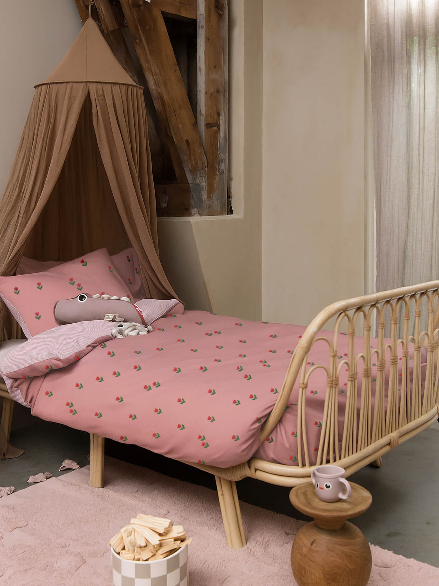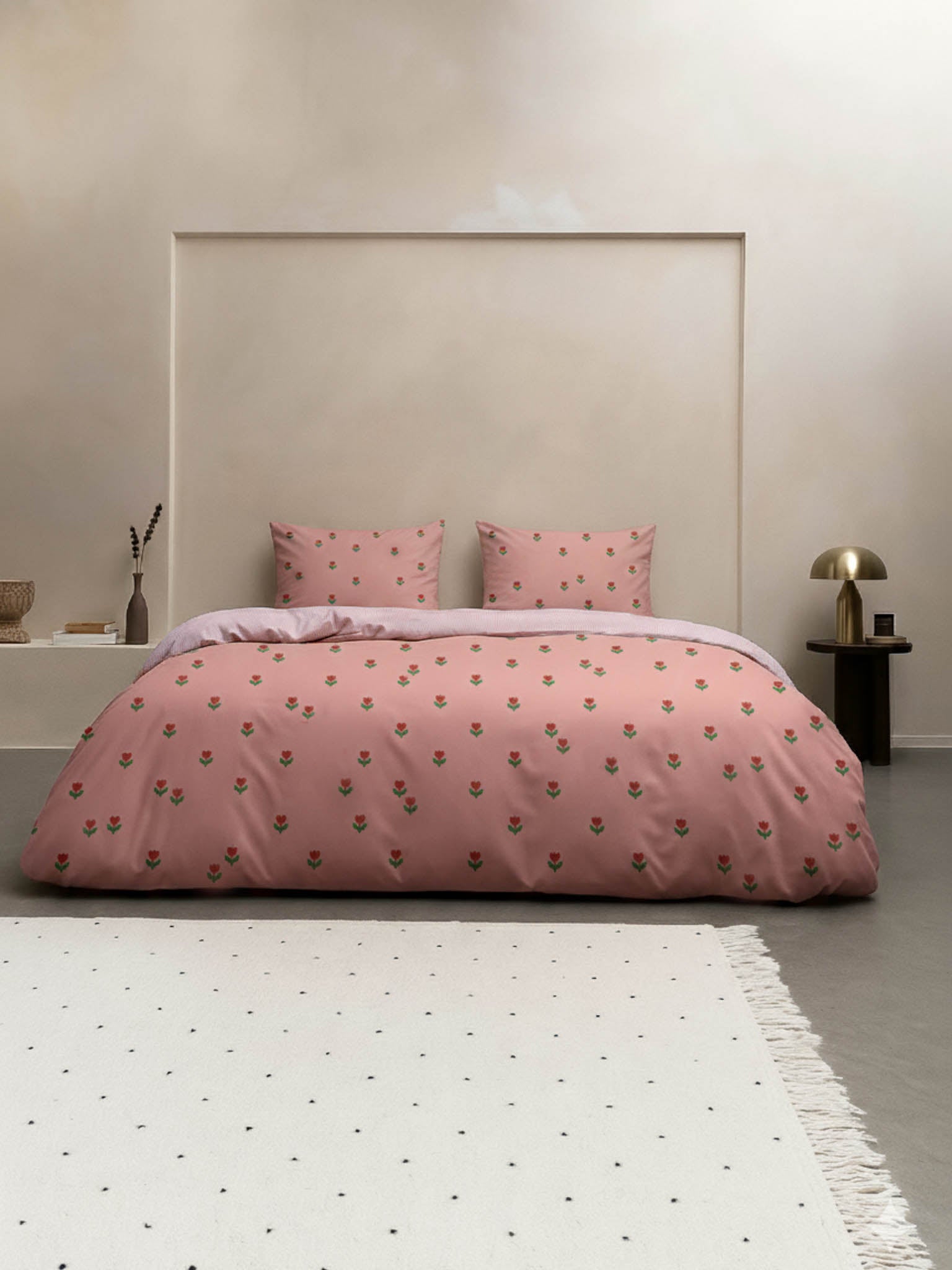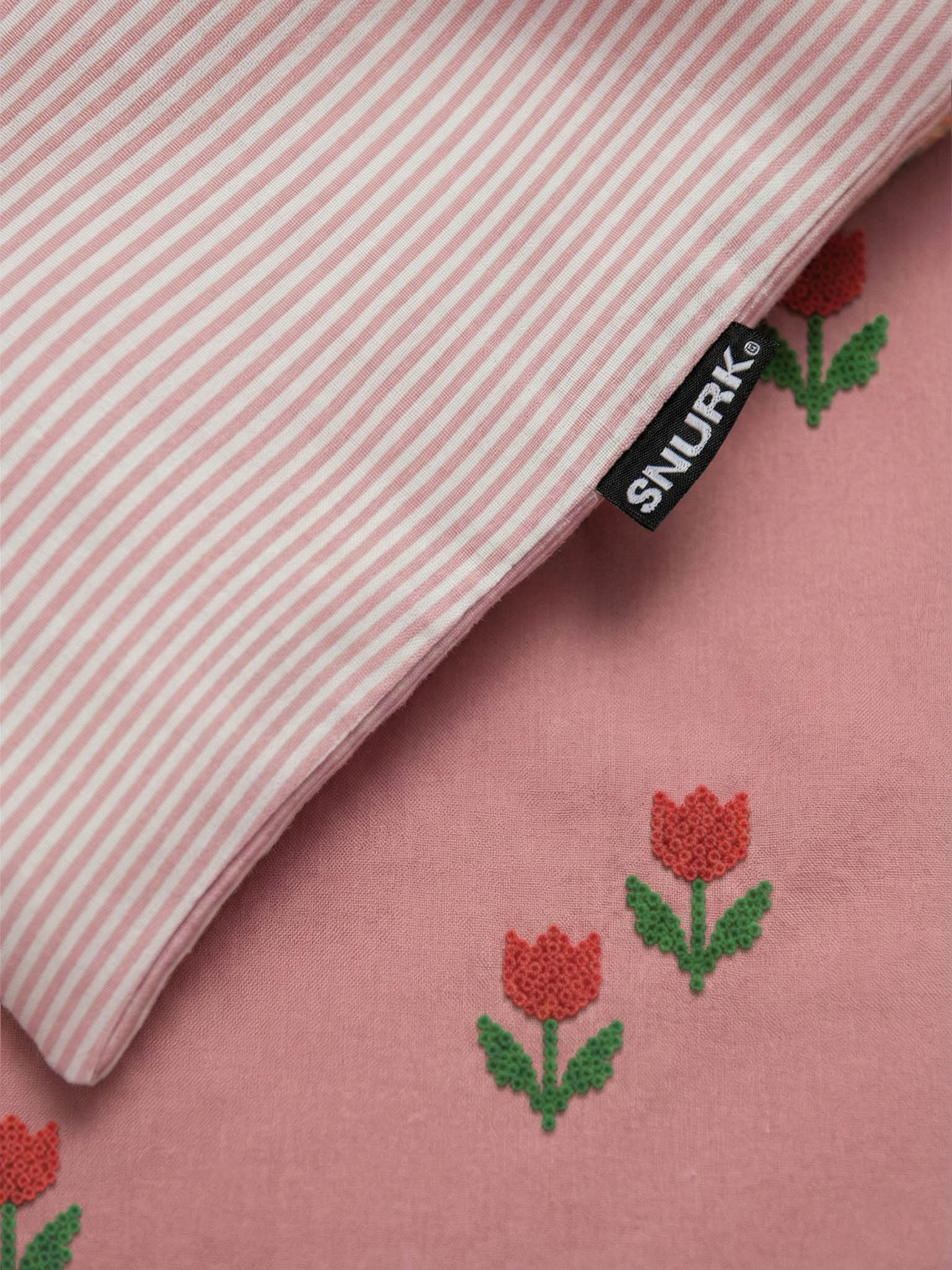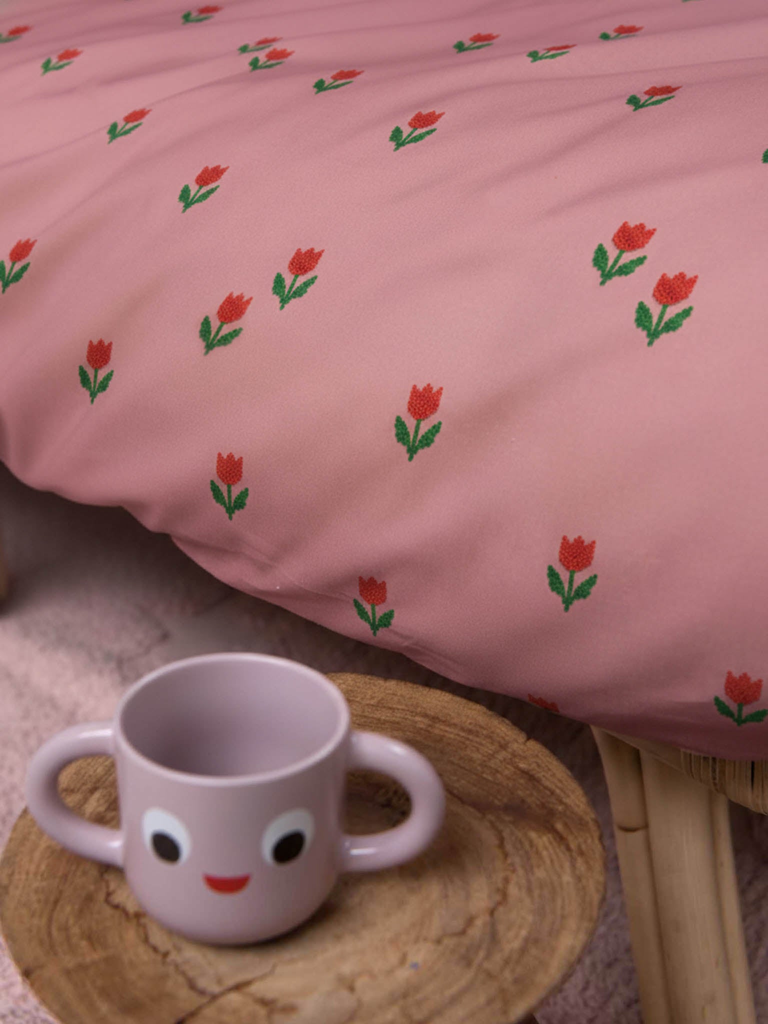 Anyone with children will be familiar with iron-on beads. They are also fun for adults to play with. We used them to make these red tulips. Just add baking paper and an iron, and you're done! Together with the warm dusty pink background color of the 100% organic cotton duvet cover, they give your bedroom a homely, cozy atmosphere. Plant your little bulb among these tulips and sleep extra well!