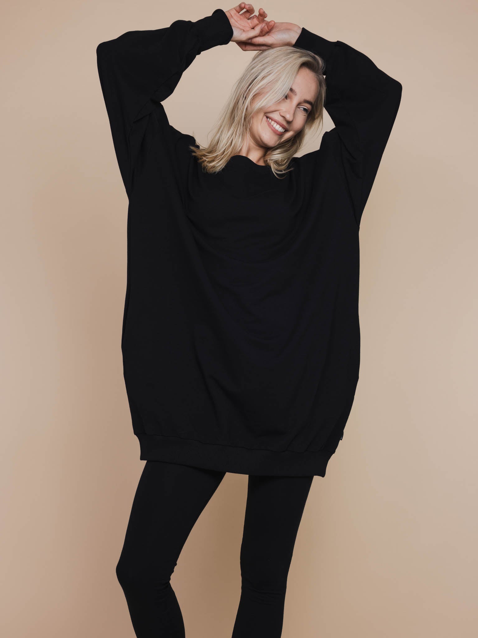Oversized sweater dress met ronde hals, lange ballon mouw, dropped shoulder, diepe zakken, heerlijk om in weg te kruipen op de bank. Deze set bevat de legging.