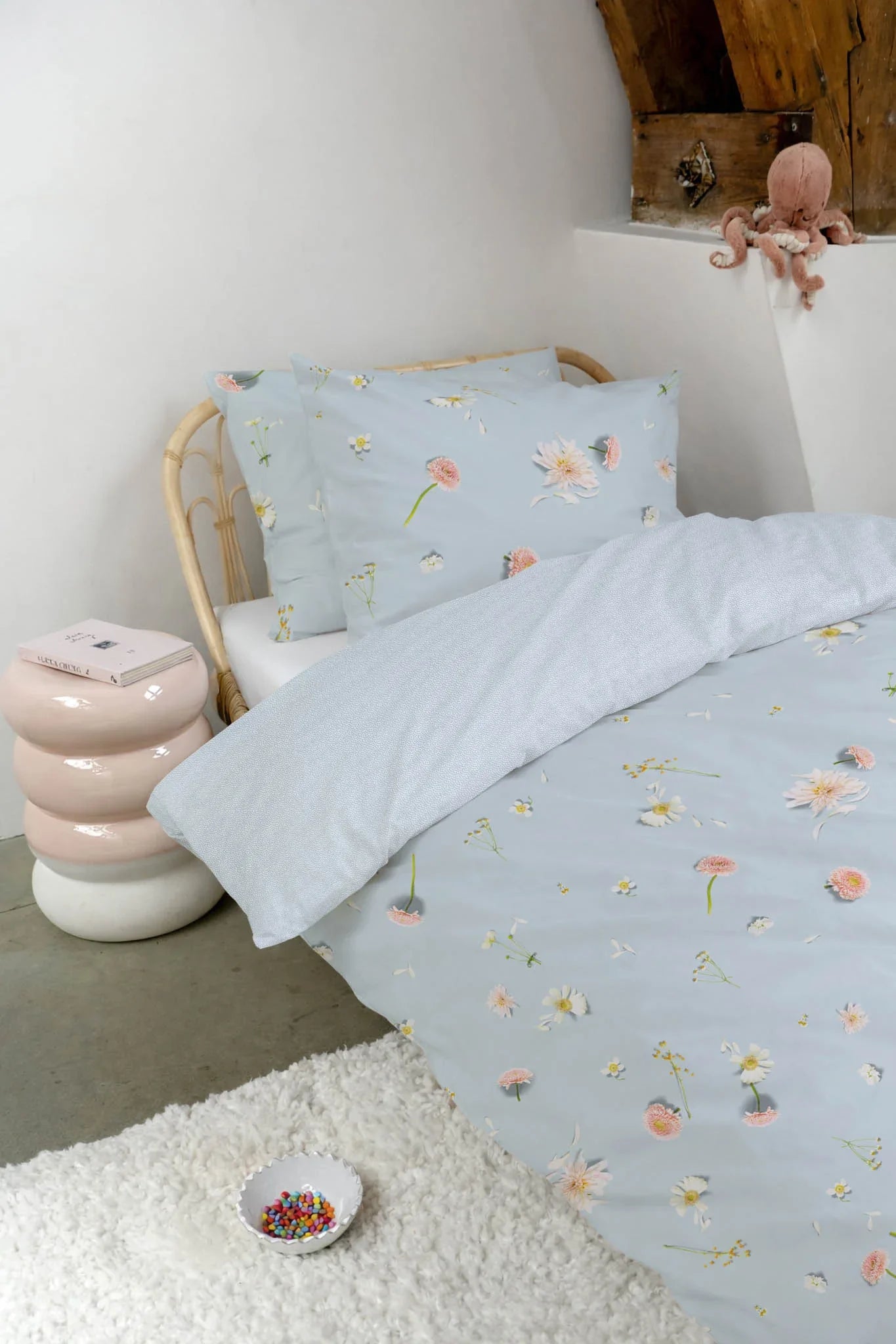 Er bloeit iets moois in je slaapkamer... Met deze print verandert je bed in een zee van levensechte, zachte bloemen op een serene lichtblauwe achtergrond. De speels gestrooide bloemblaadjes fluisteren: ze houdt van me, ze houdt niet van me... Maar laten we eerlijk zijn, van dit dekbed ga jij gegarandeerd 100% houden. Droom zacht tussen de bloemen en laat de liefde maar groeien.