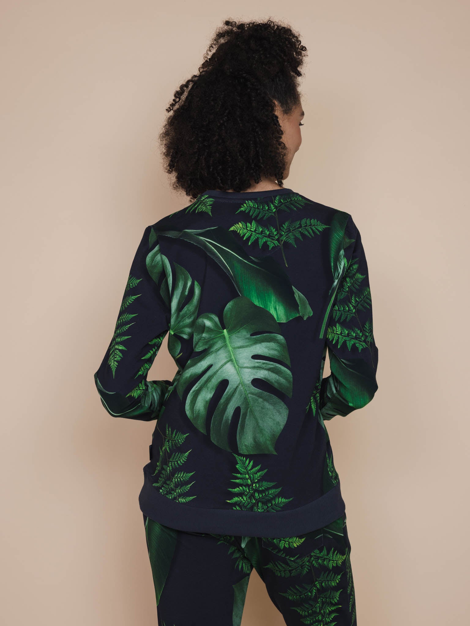 Dames sweater en broek met fotoprint gemaakt van 95% biologisch katoen, 5% elastaan.