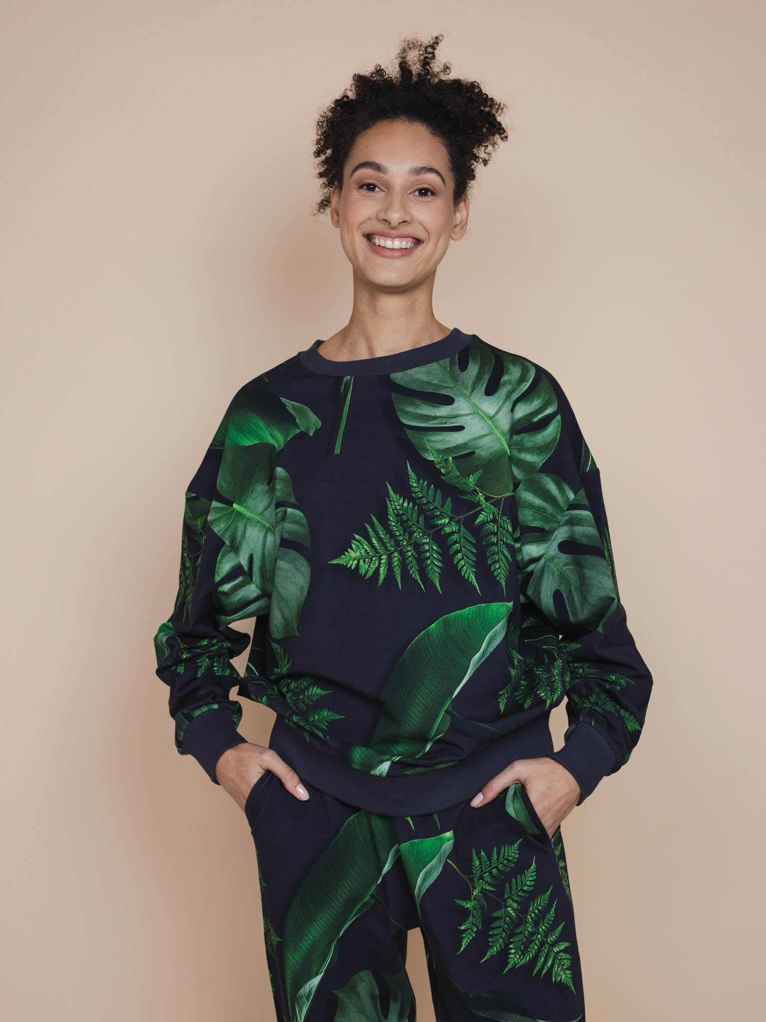 Ruimvallende unisex sweater en broek set gemaakt van 95% biologisch katoen, 5% elastaan.