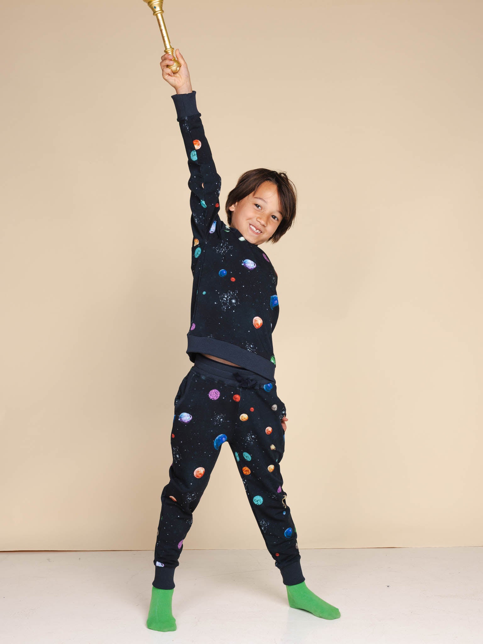 Kinder sweater en broek set met fotoprint gemaakt van 95% biologisch katoen, 5% elastaan.