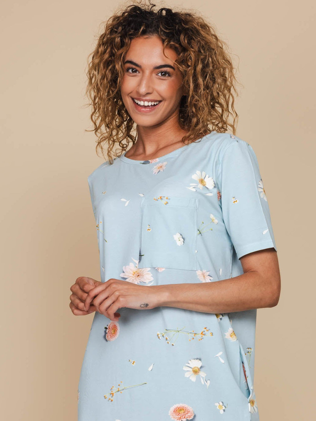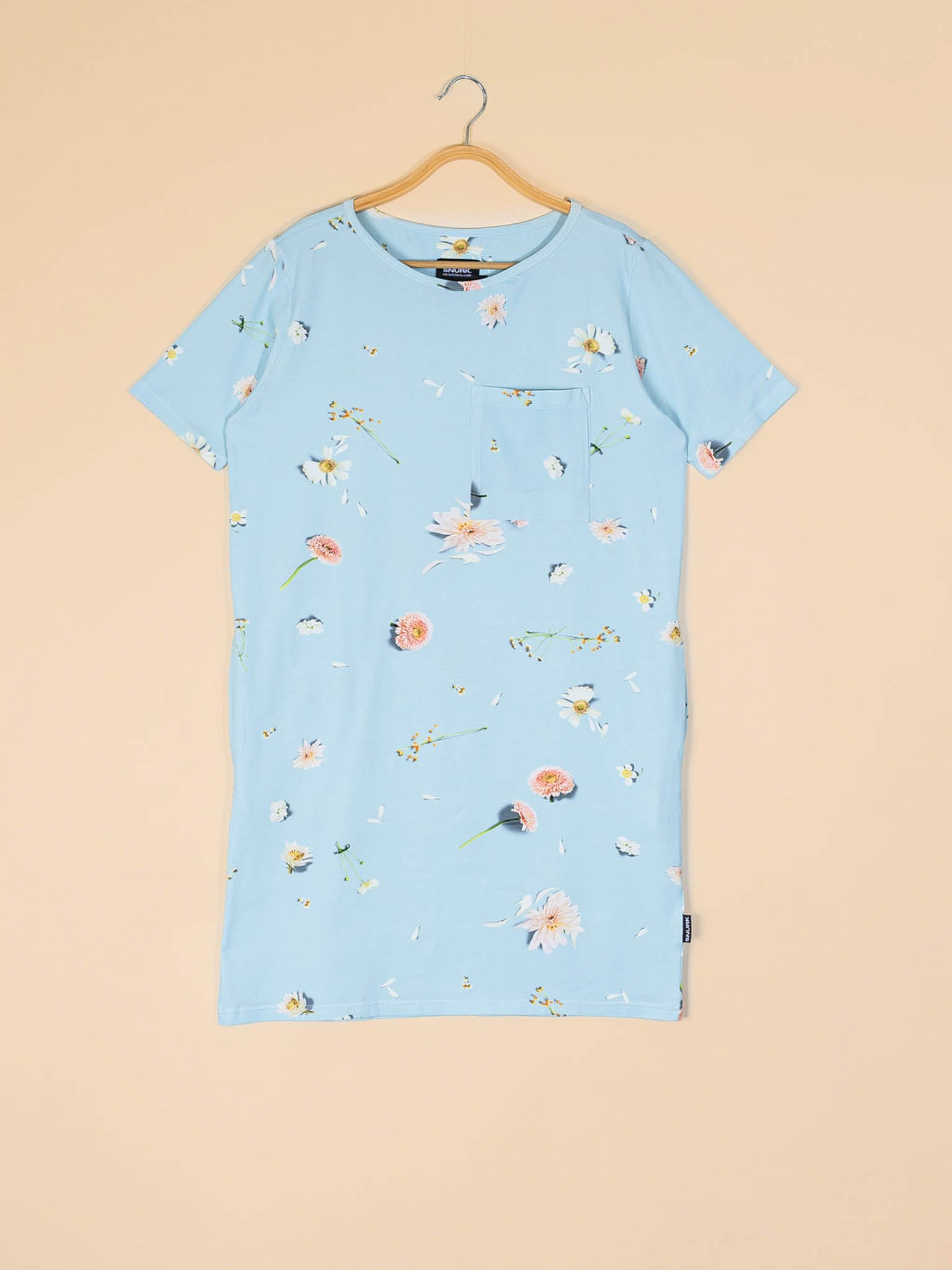 Deze is voor de bloemenliefhebbers en bankhangers met stijl. Een print van wit en zachtroze veldbloemen nonchalant verspreid op lichtblauw is romantiek op z’n SNURKs. Gemaakt van luchtig biologisch katoen. Ben jij ook hopeloos verliefd?