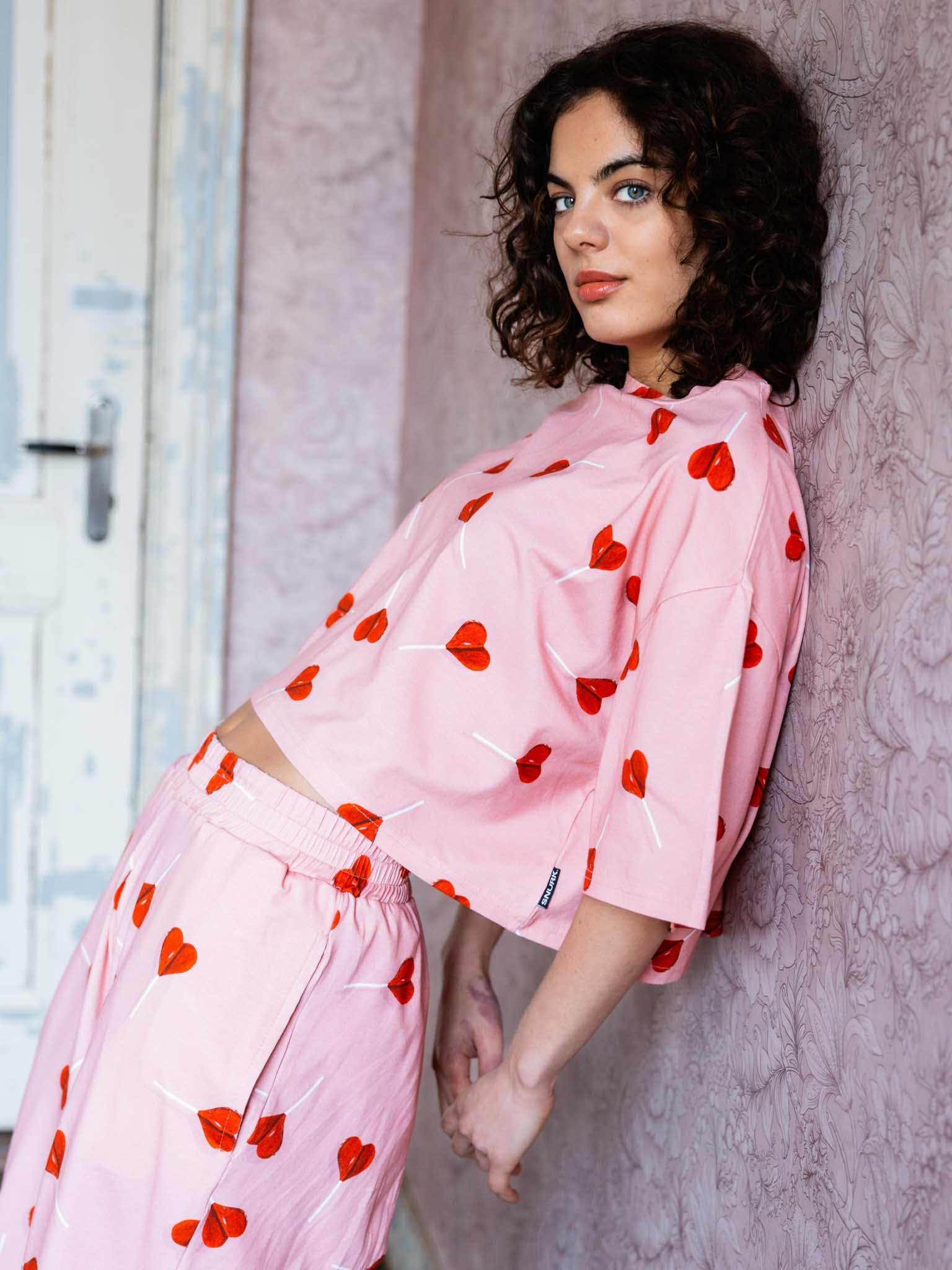 Alle gekheid op een stokje, deze print van fel rode hartjes lollies op roze achtergrond zijn toch te gezellig? Zoet, vrolijk en bomvol good-vibes. Gemaakt van zacht biologisch katoen. Of je nu heel klein bent of groot, hier gaat elk hartje sneller van kloppen.