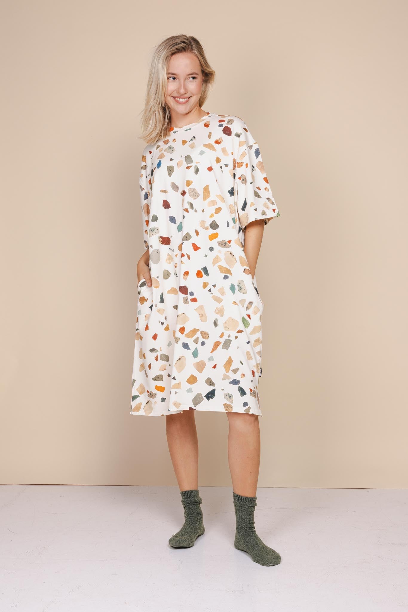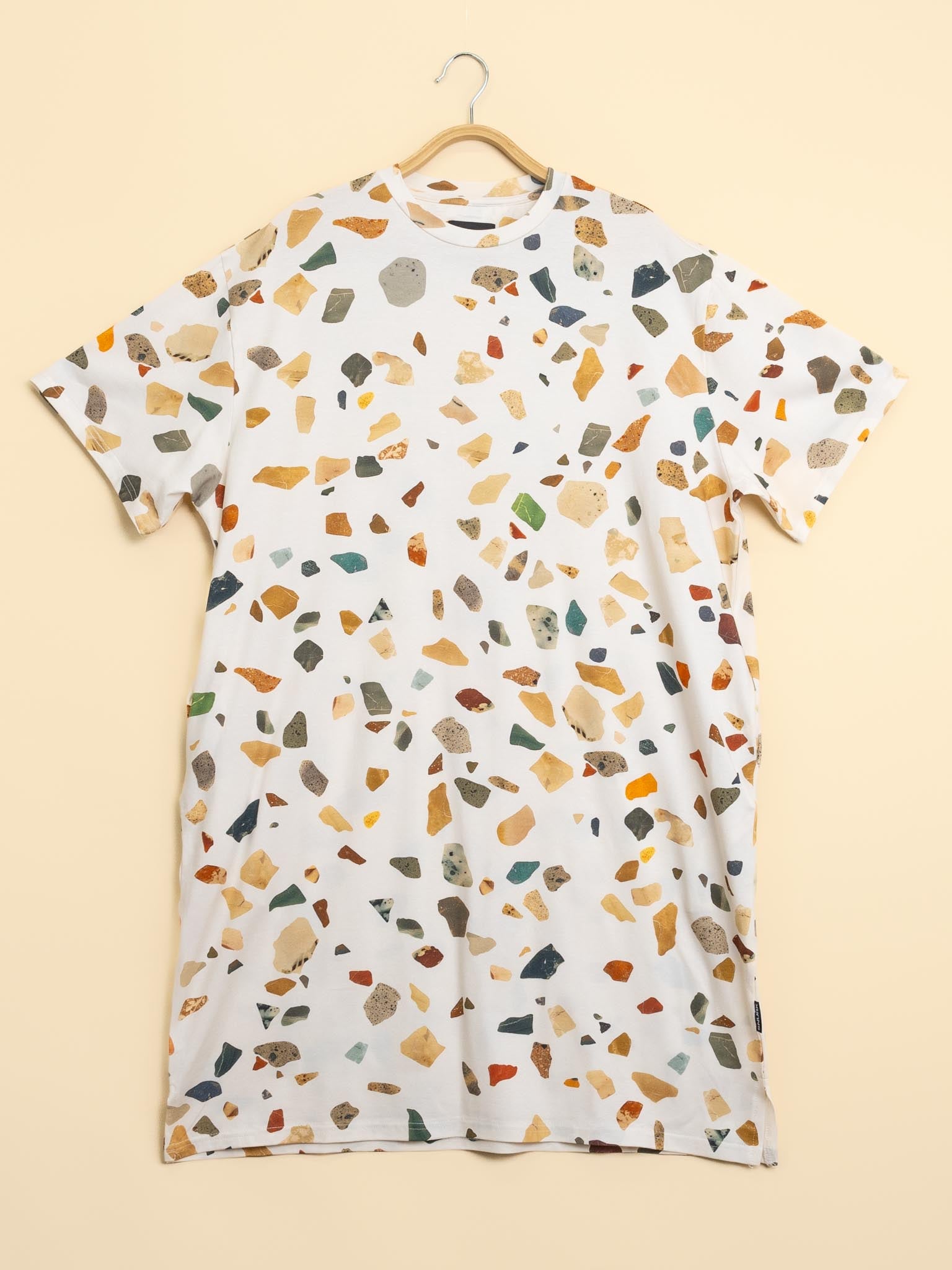 Geïnspireerd op het klassieke terrazzo: een mix van stukjes steen, glas of marmer die samen een nieuw geheel vormen. Net als in deze print, met spikkels in warme aardetinten die zorgen voor structuur met een twist. Dat werkte al steengoed op ons beddengoed en nu ook op onze comfortabele loungewear van zacht biokatoen.