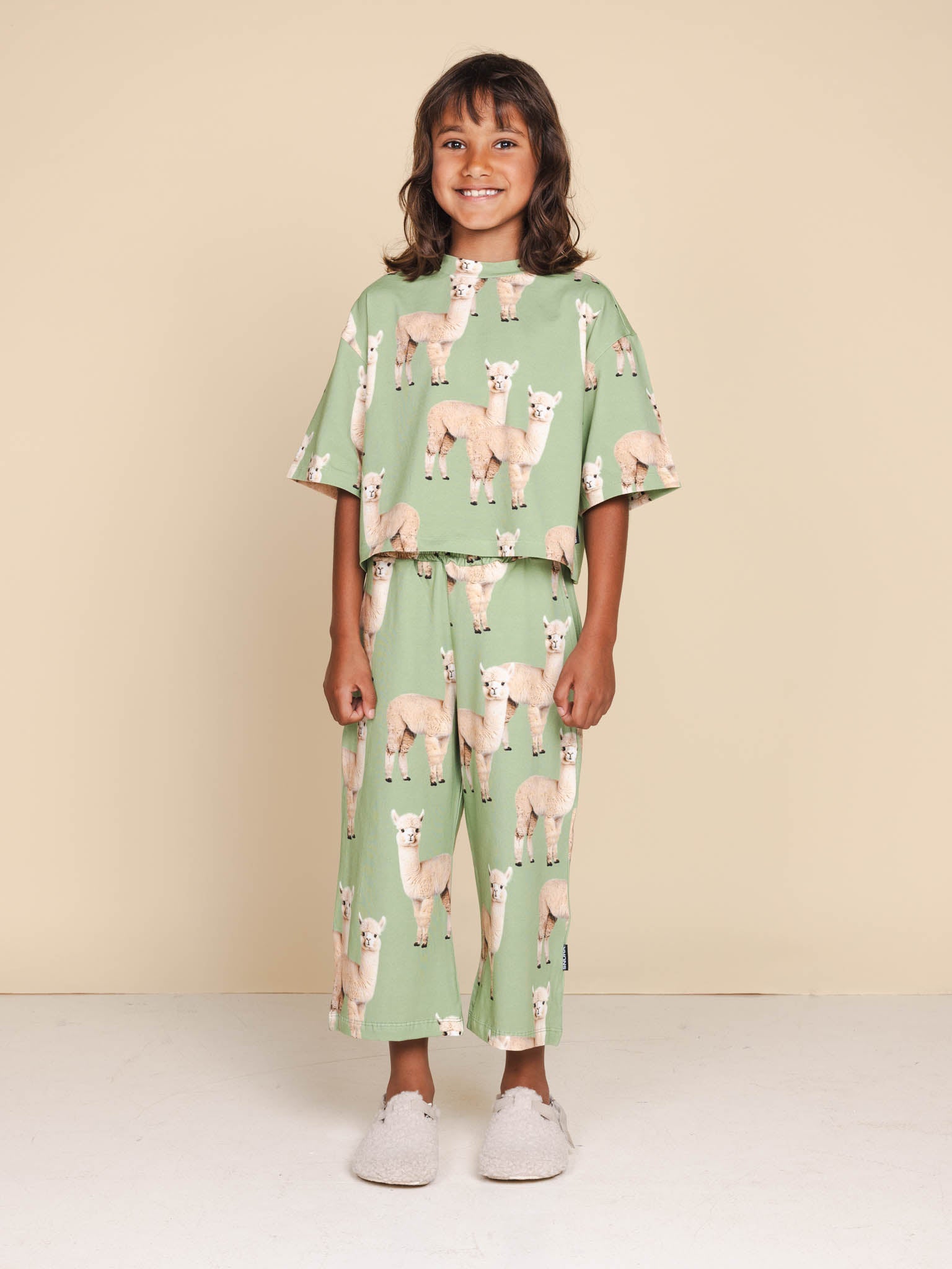 Cropped T-shirt en wijde broek set voor kinderen gemaakt van 95% biologisch katoen, 5% elastaan.
