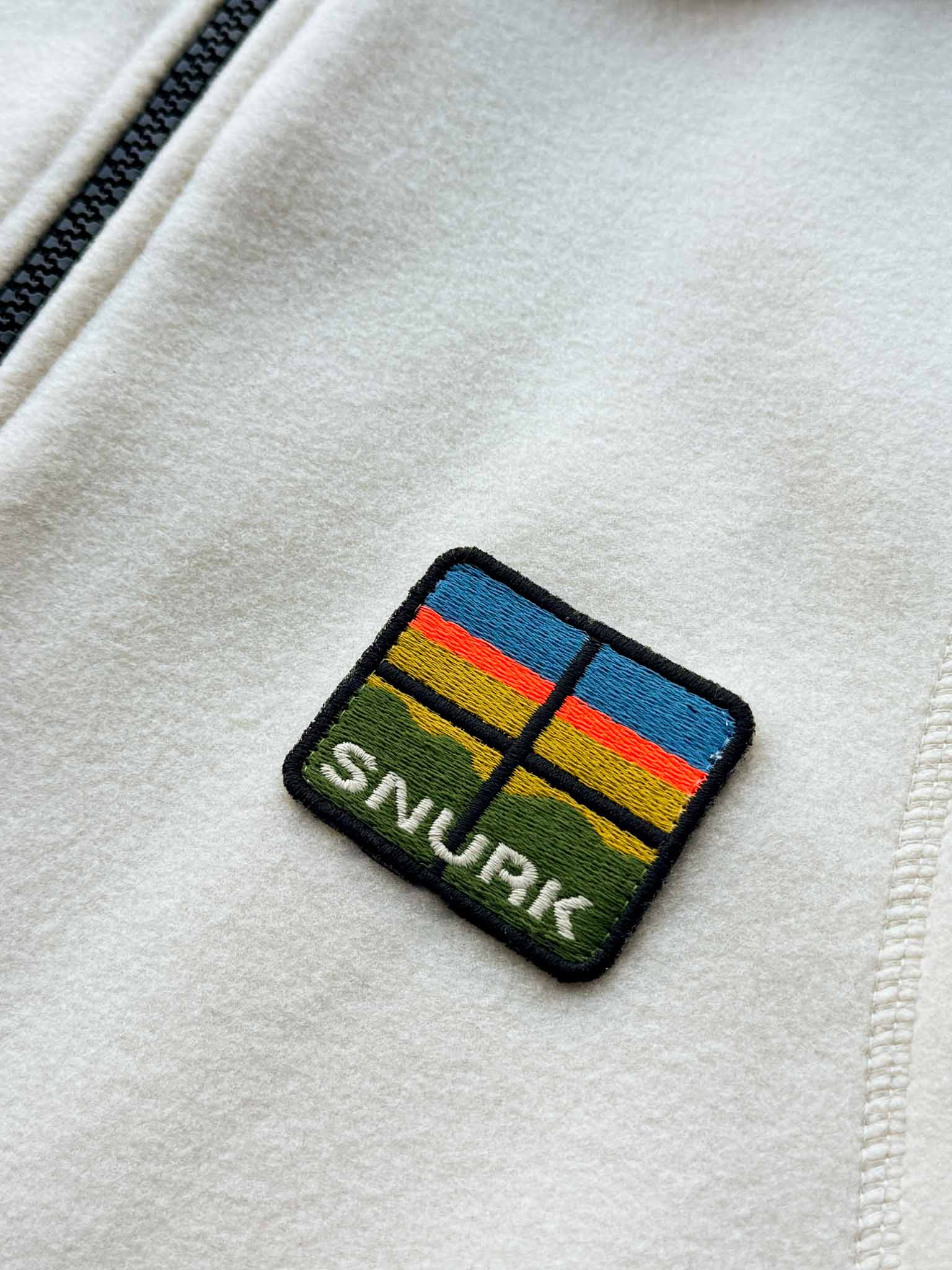 Zachte fleece bodywarmer met ritssluiting en diepe steekzakken om je handen lekker warm te houden. Geborduurde patch op de borst met SNURK logo en raam/bergen illustratie.