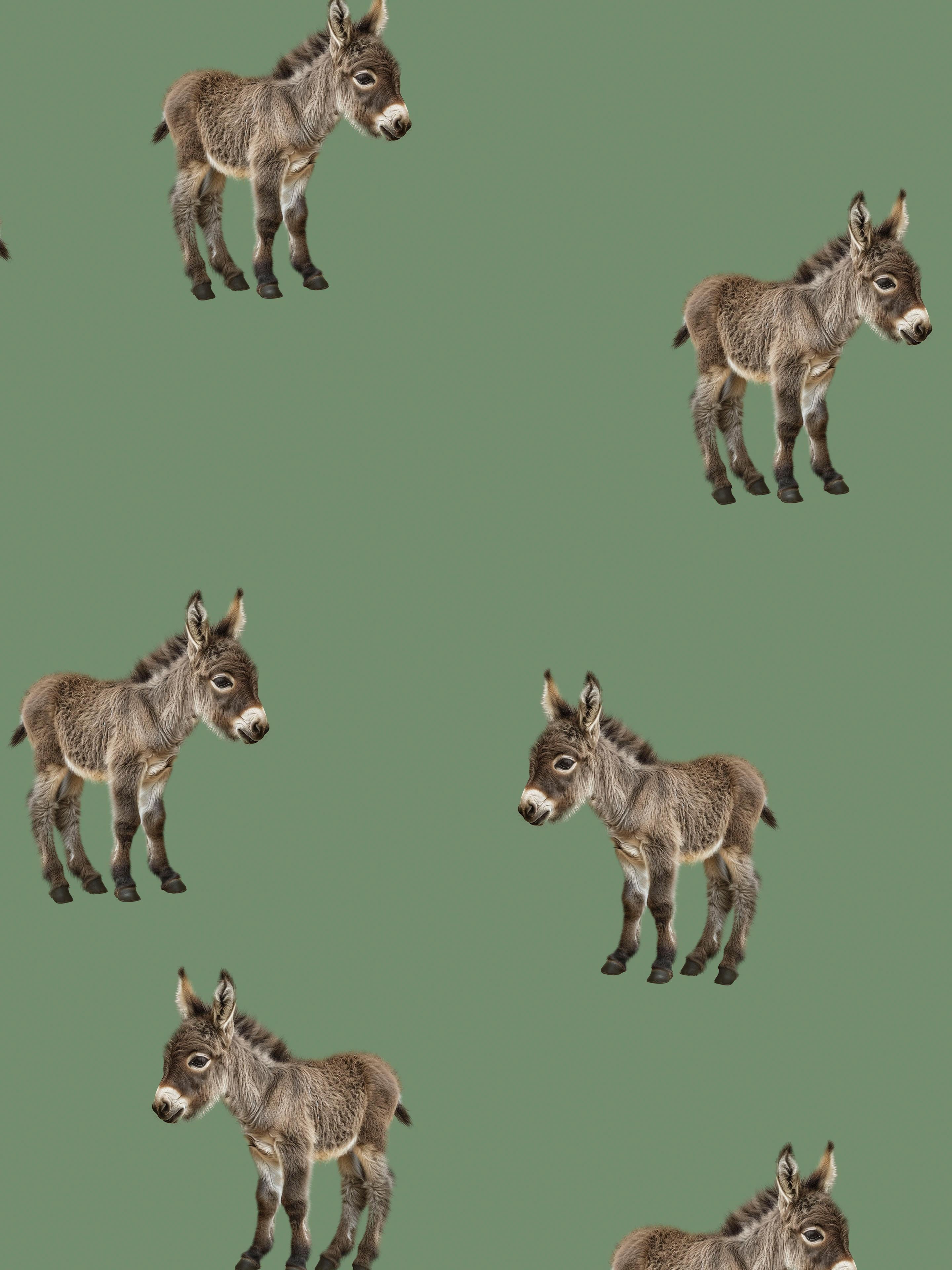 Een kudde wollige baby-ezels graast op een zachtgroene achtergrond. Lief, eigenwijs en met karakter, precies zoals je van ons gewend bent. Gemaakt van zacht biologisch katoen met stretch. Zo comfy dat je koppig weigert nog ergens naartoe te gaan. Thuisblijven dan maar? I-jaaa!
