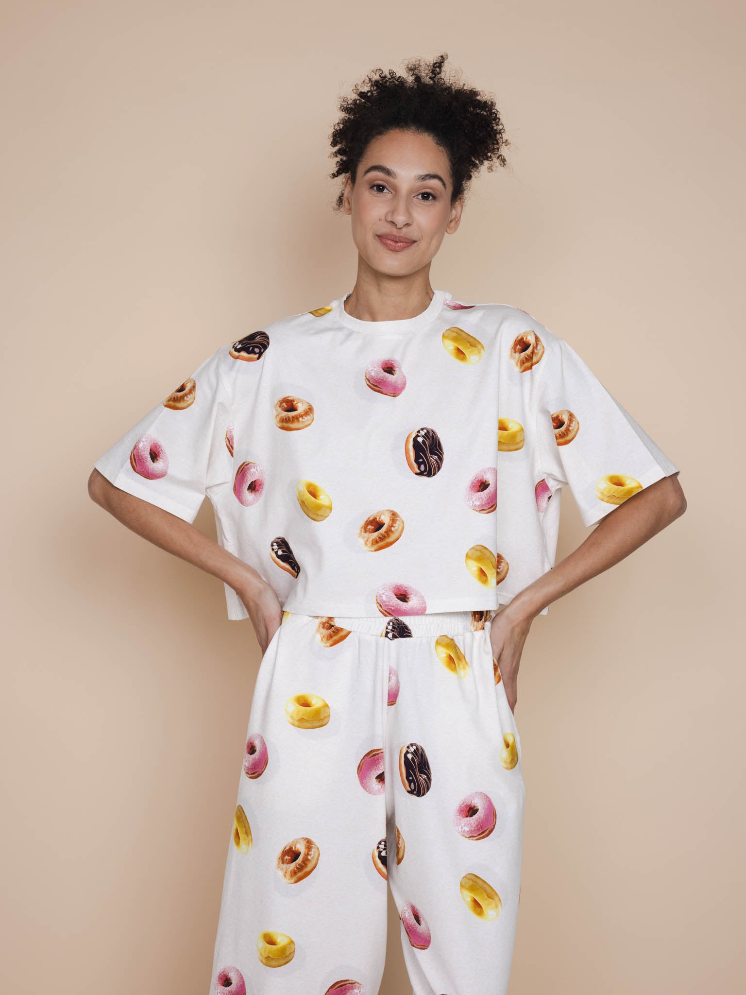 Set van cropped t-shirt met hoge ronde hals, drop shoulder, wijde korte mouwen, 2 a 3 cm langer dan gemiddelde crop top en een wijde broek met extra diepe zakken en elastische tailleband, om dag en/of nacht te dragen