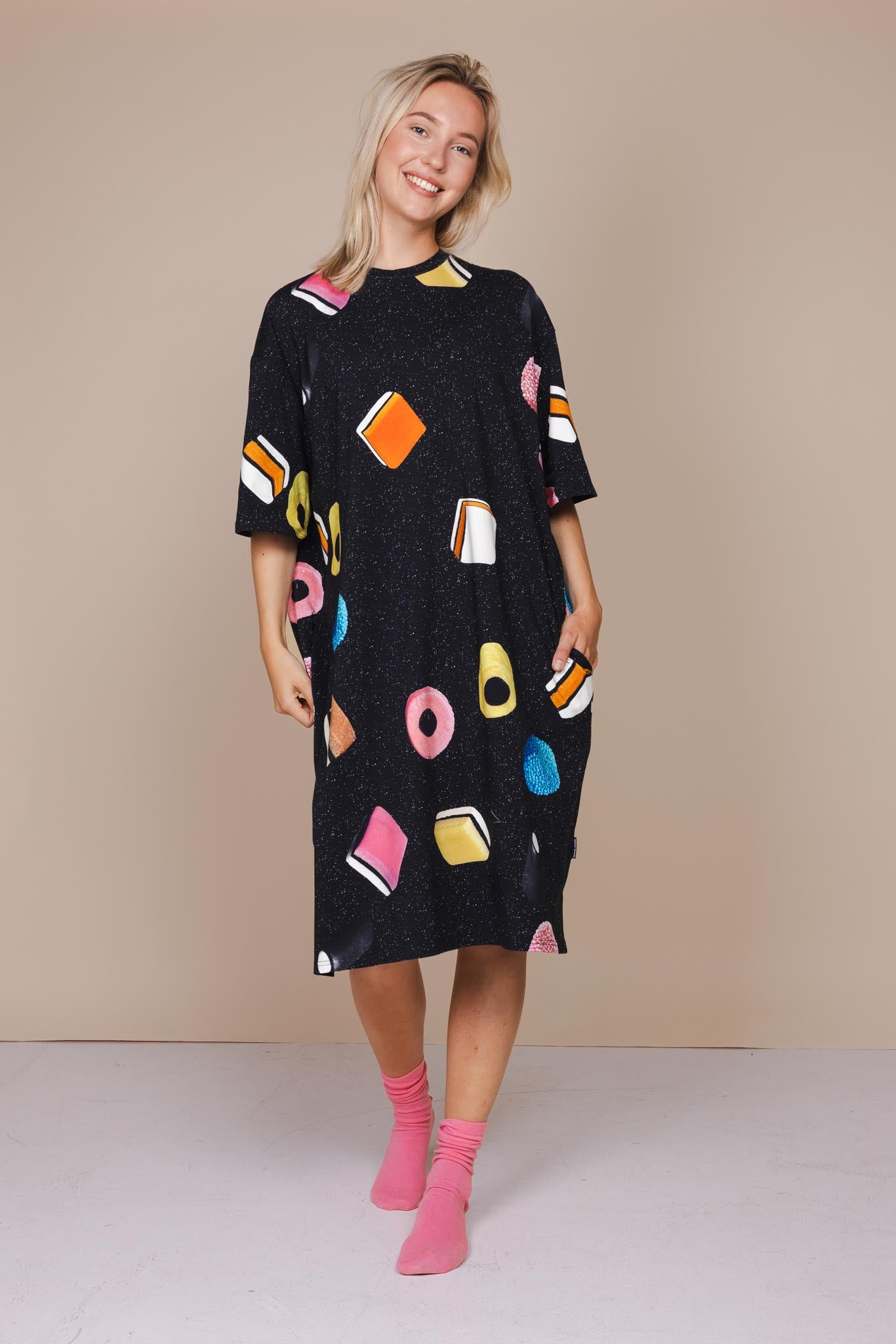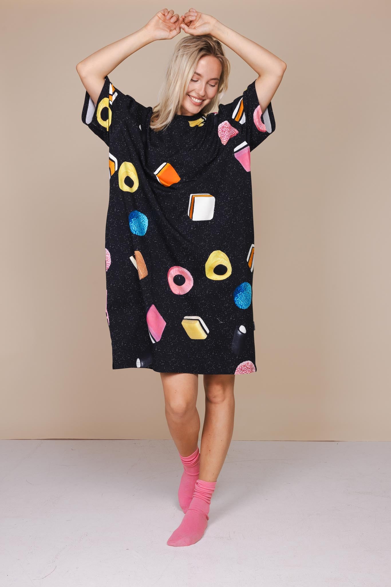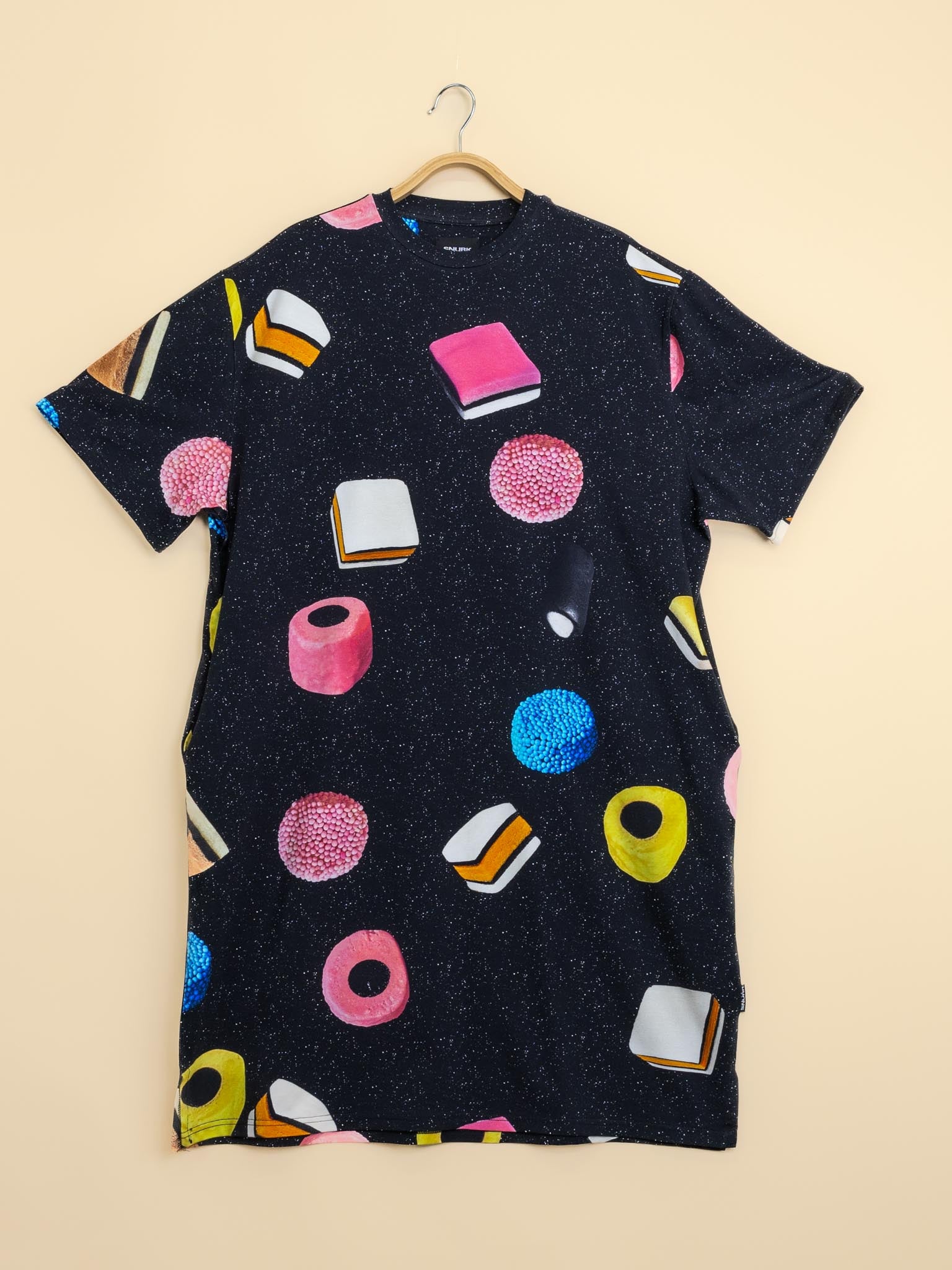 Onze special drop van dit seizoen: een mix van vliegende Engelse dropjes op een zwarte universe-achtergrond. Deze print is zo lekker, dat we ‘m halverwege het seizoen nog snel aan de collectie hebben toegevoegd. Let op: deze drop gaat hard en de voorraad is beperkt. Wij graaien zelf altijd eerst die met de blauwe spikkels eruit.