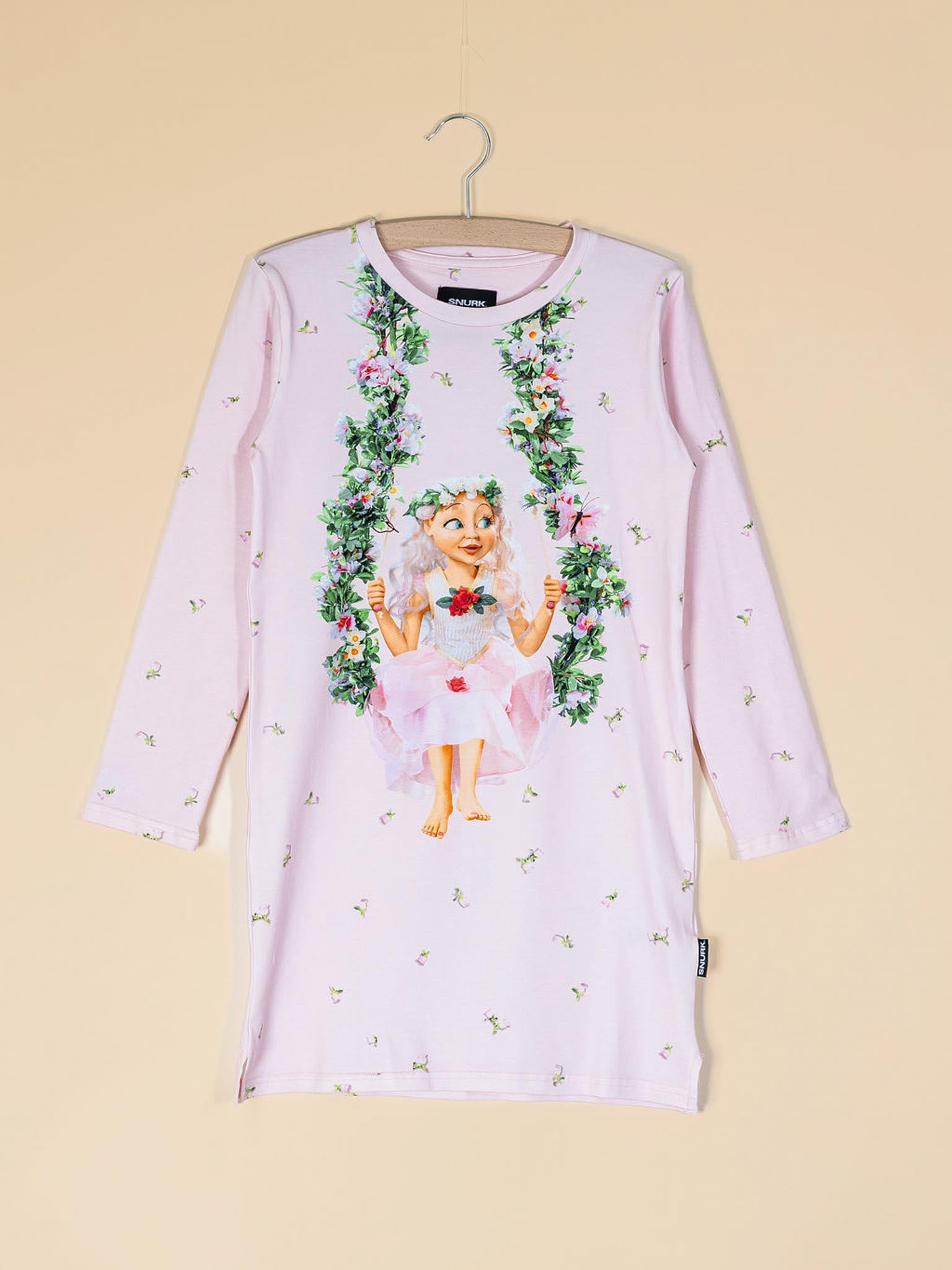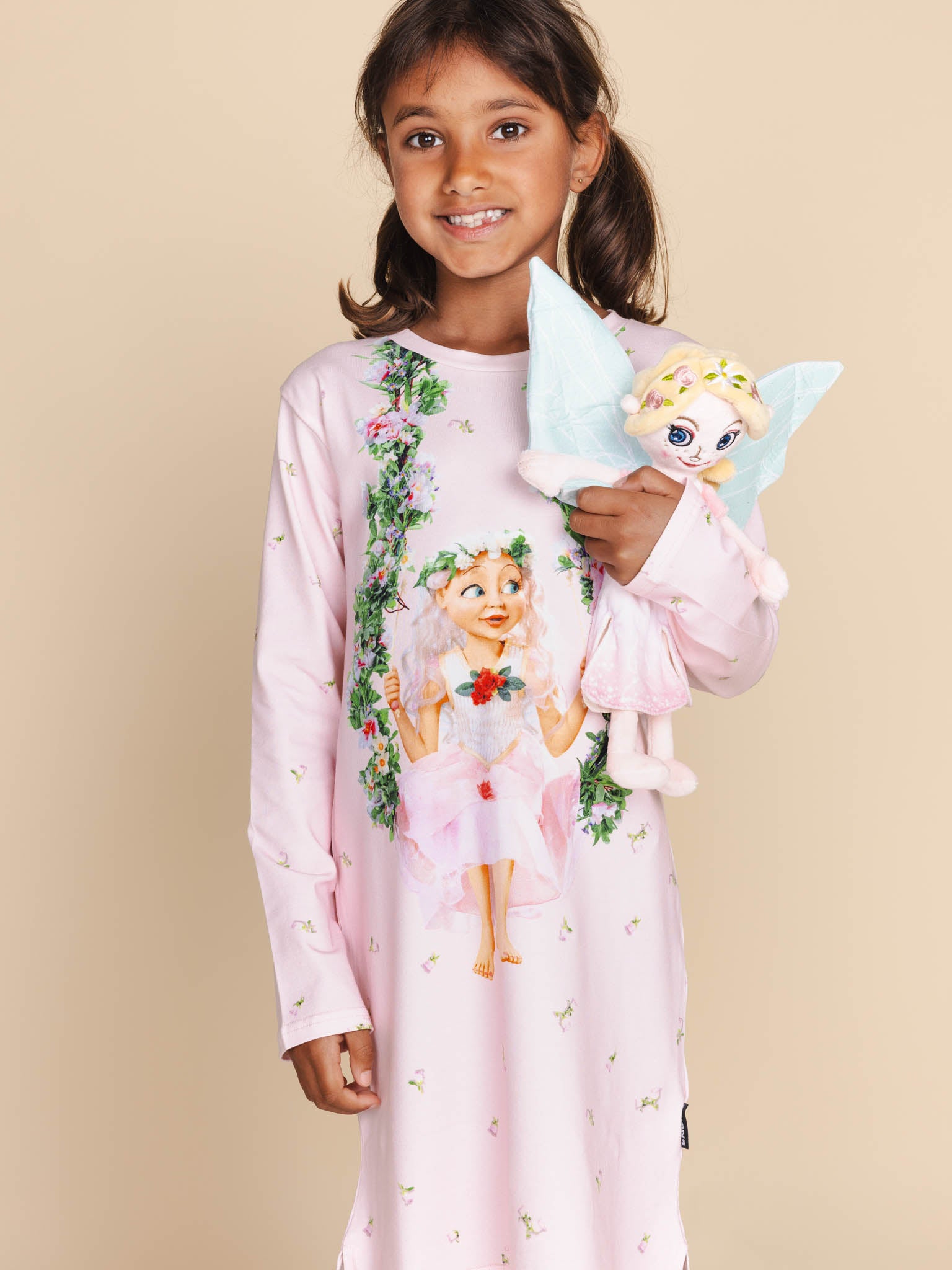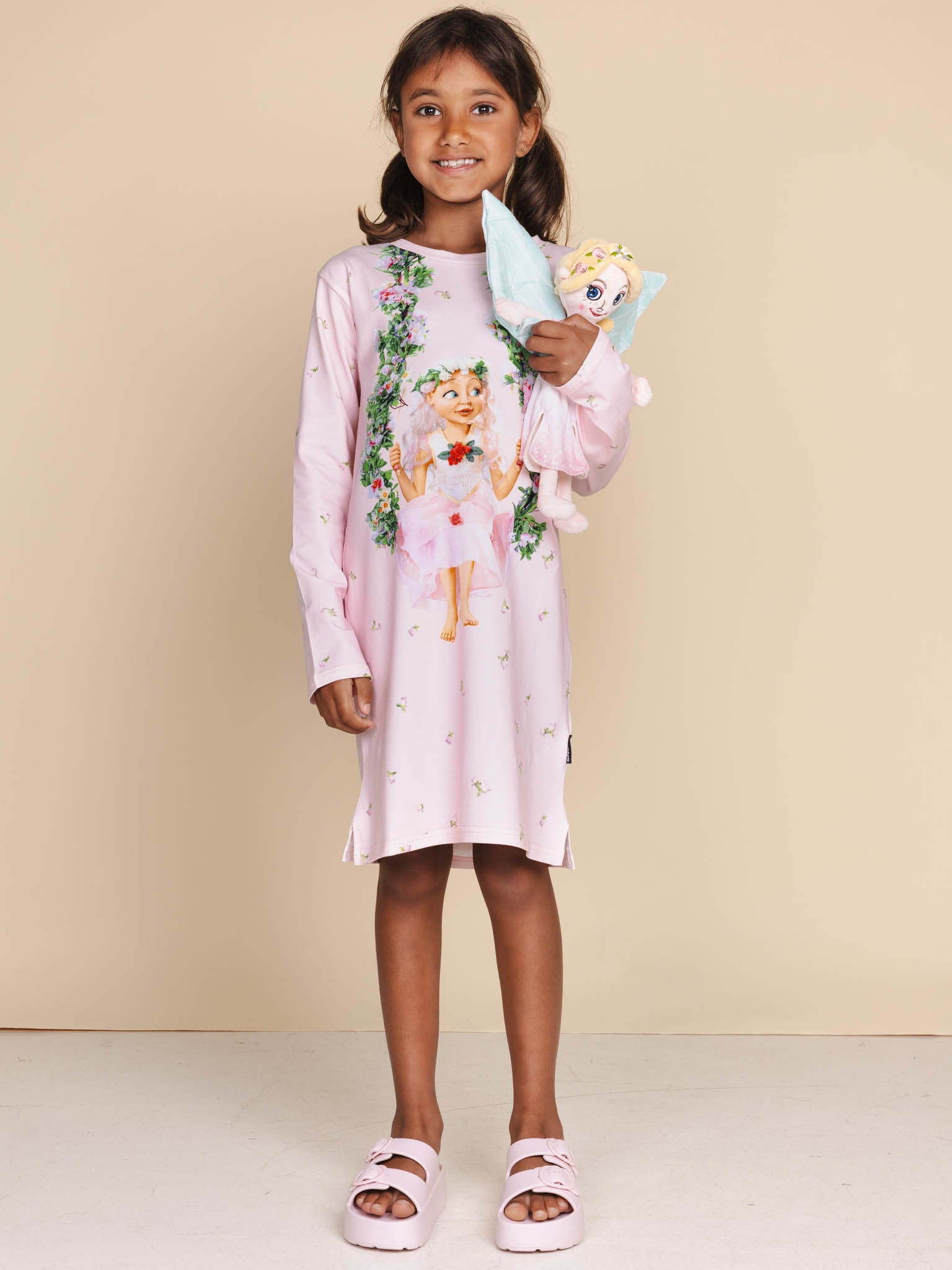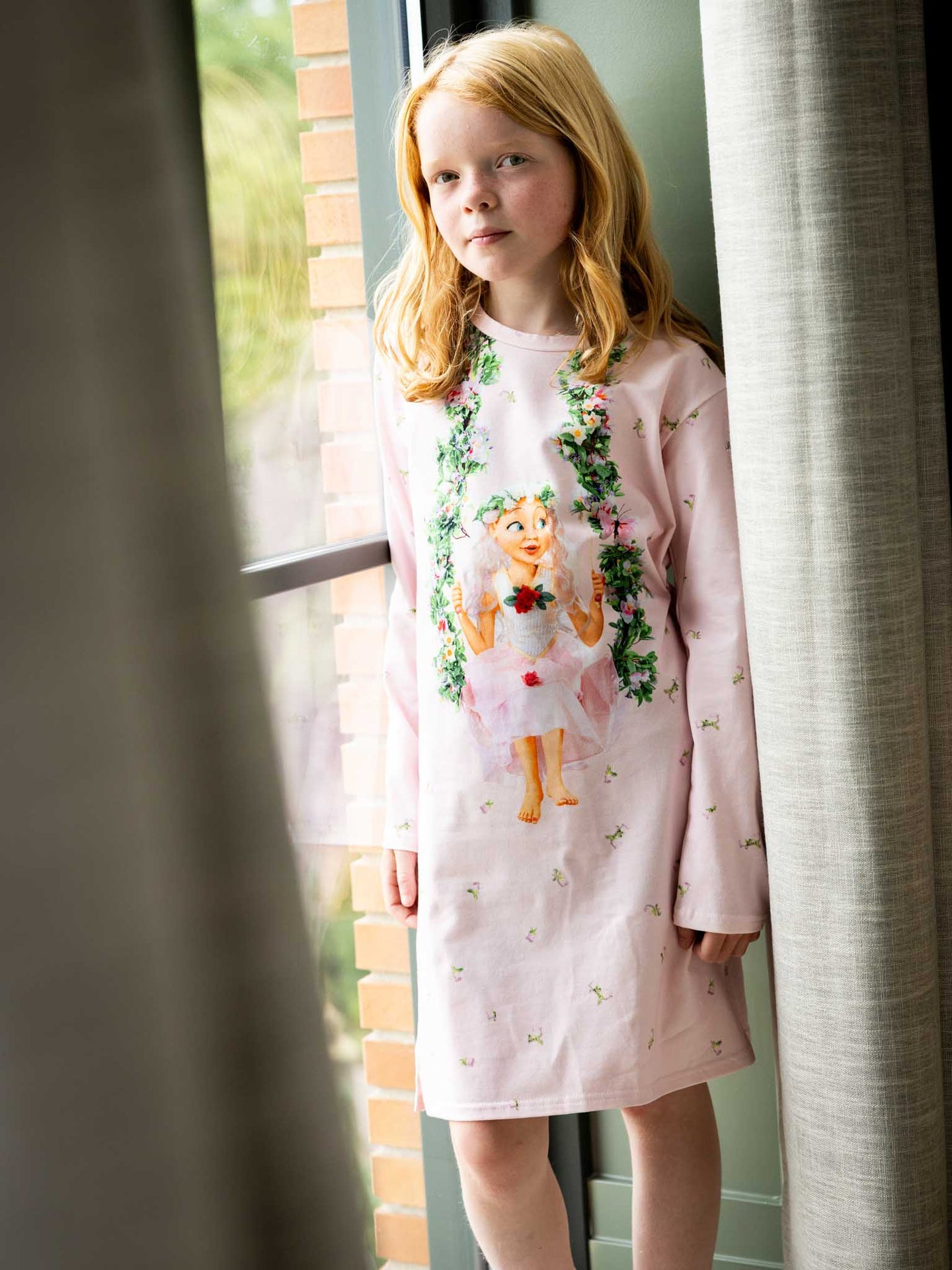 Deze zachtroze outfit brengt je naar de wereld van Droomvlucht, met zwevende elfjes, bloemenpracht en een vleugje magie.