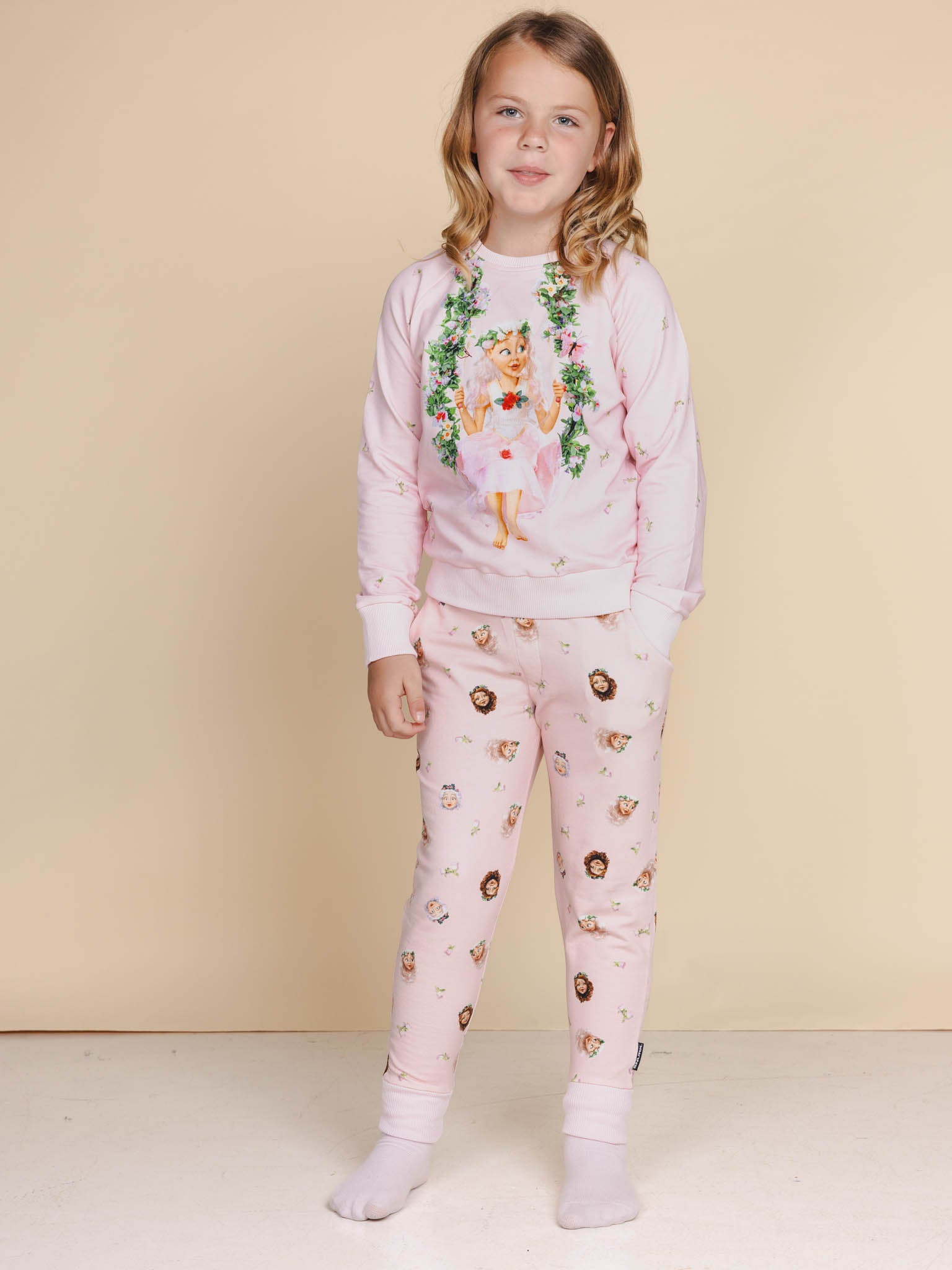 Deze zachtroze outfit brengt je naar de wereld van Droomvlucht, met zwevende elfjes, bloemenpracht en een vleugje magie. Op je broek fladderen nog meer figuren uit de elfentuin met je mee.