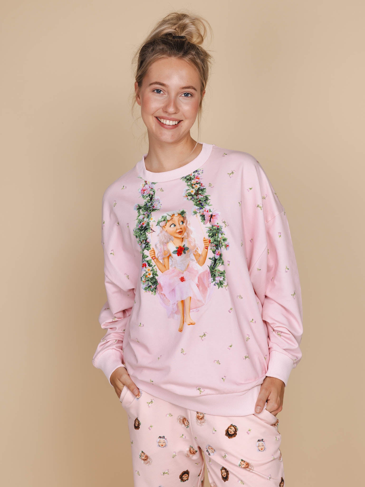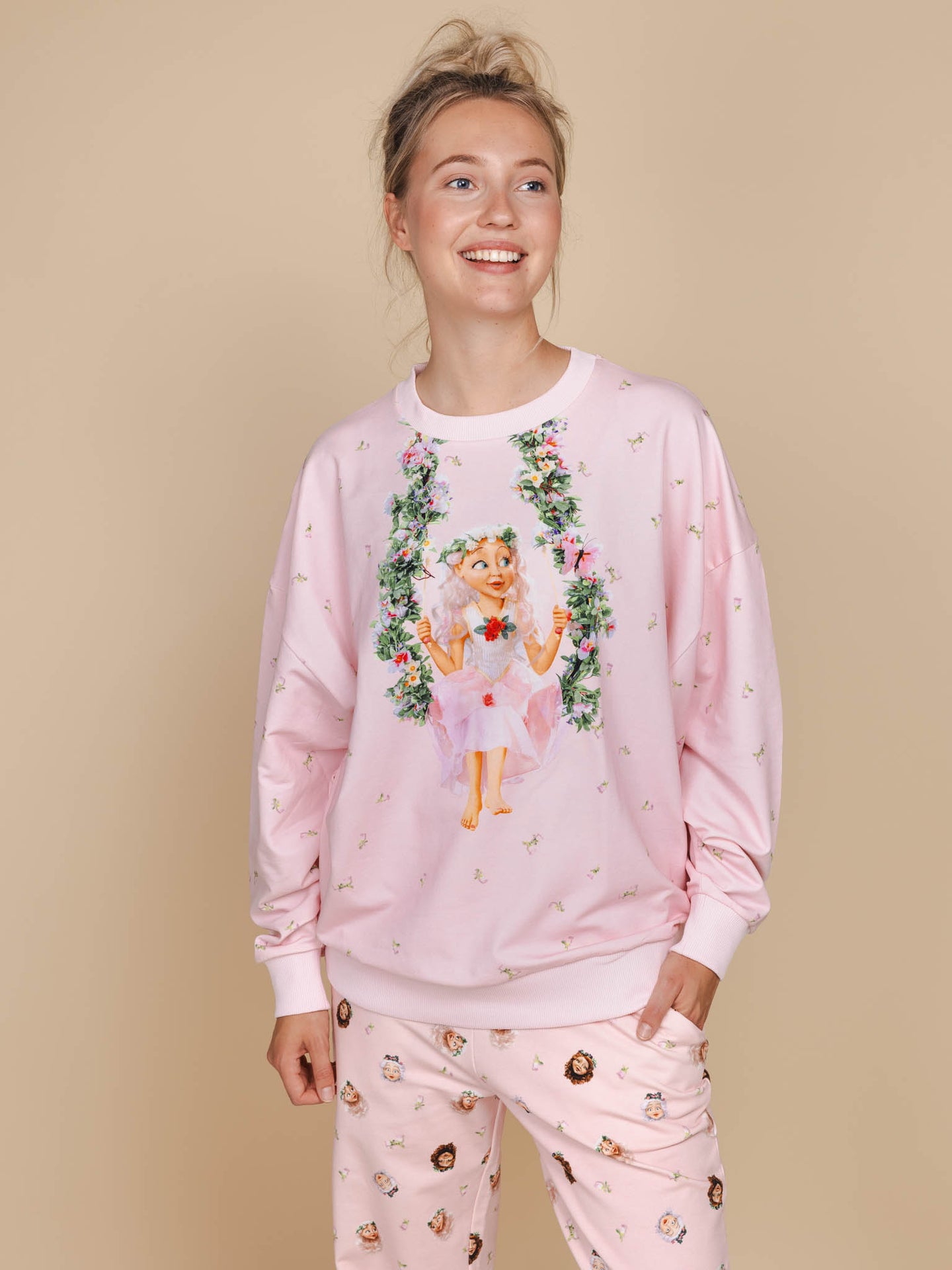 Bekijk de setDeze zachtroze outfit brengt je naar de wereld van Droomvlucht, met zwevende elfjes, bloemenpracht en een vleugje magie. Op je broek fladderen nog meer figuren uit de elfentuin met je mee.