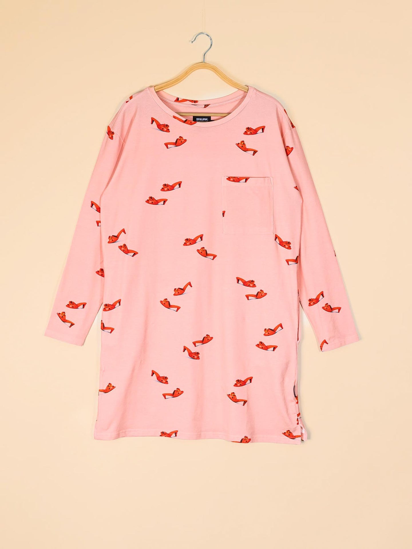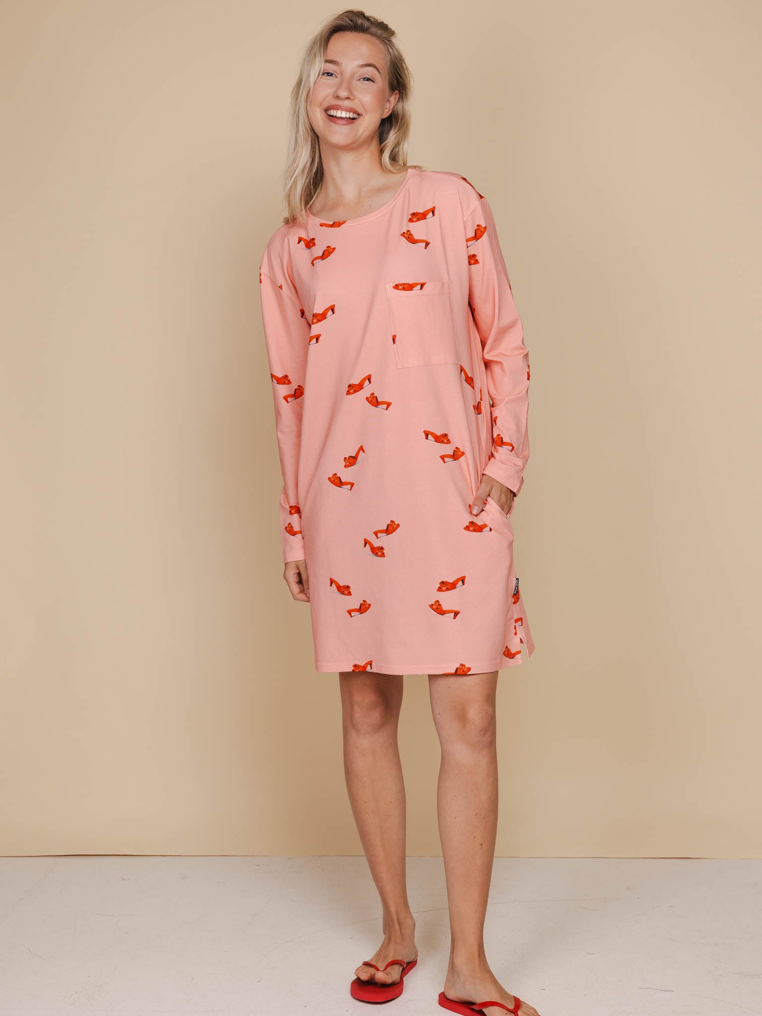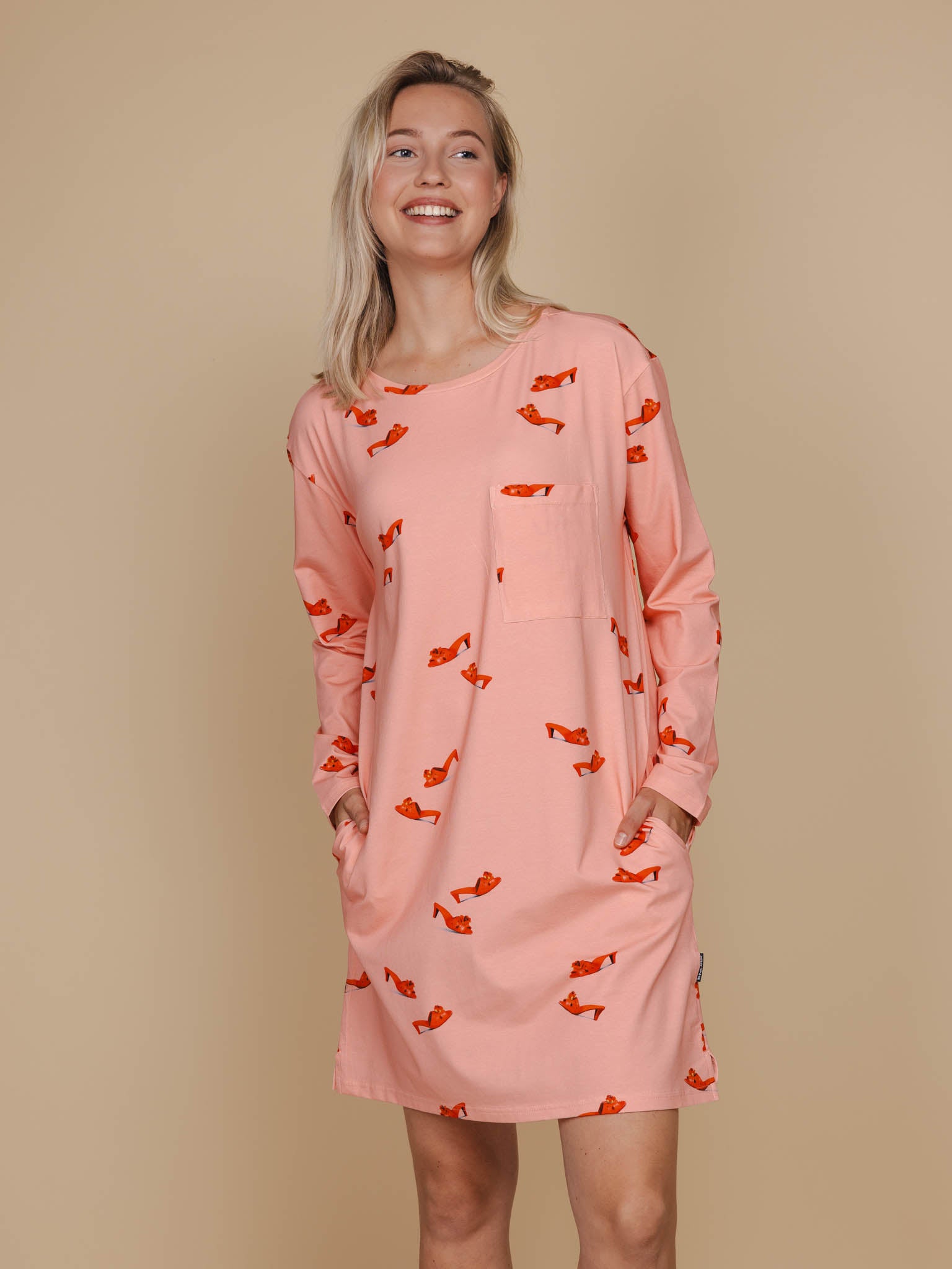 Jurkje met lange mouwen, van zachte stretch katoen, met wijde hals, diepe zakken en borstzakje