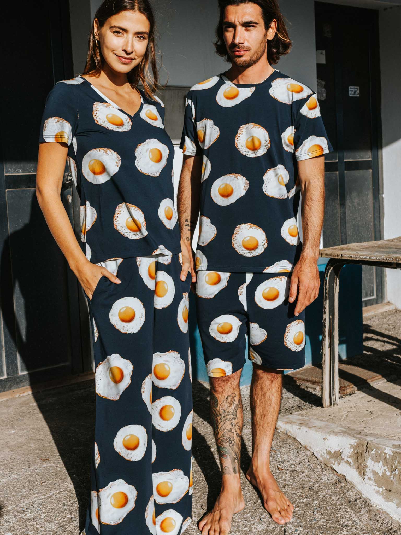 Lekker slapen wordt voortaan een eitje. Onze gebakken eieren print in navy blauw is gemaakt van superzacht biologisch katoen: vrije-uitloop-kwaliteit voor je huid. Zacht, comfy en met een print waar je vrolijk van opstaat. Met deze SNURK zit én lig je altijd gebakken.
