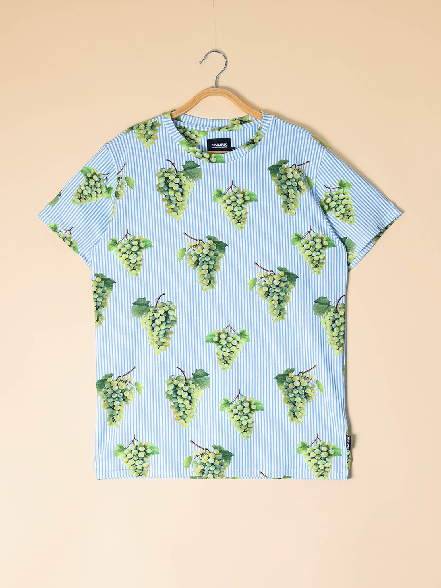 De witte druiventrosjes op lichtblauwe streepjes hebben iets zonnigs zonder te schreeuwen. Ze doen denken aan koele ochtenden in een mediterrane tuin, waar alles nog licht en fris voelt. Het biologische katoen valt luchtig om je heen en beweegt moeiteloos met je mee. Alsof je even weg bent, zonder je huis te verlaten.