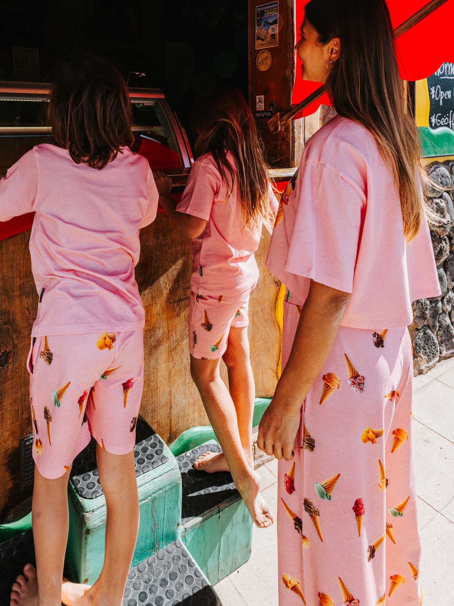 Heb jij ook nog plek over voor een ijsje? Maar liefst 5 heerlijke Italiaanse bollen ijs stapelden we op een hoorntje op je shirt. Op ware grootte, zo kan je ‘m al bijna vasthouden en proeven! Voor de broeken en jurkjes kozen we voor een vrolijke rondvliegend ijshoorntjes patroon op een warme roze achtergrond. Smelt jij ook?