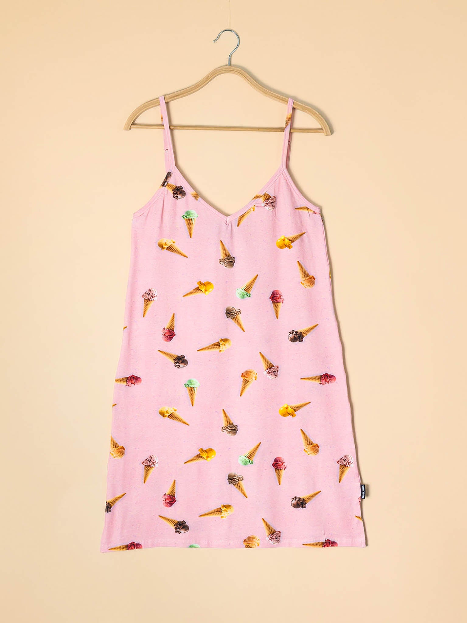 Heb jij ook nog plek over voor een ijsje? Maar liefst 5 heerlijke Italiaanse bollen ijs stapelden we op een hoorntje op je shirt. Op ware grootte, zo kan je ‘m al bijna vasthouden en proeven! Voor de broeken en jurkjes kozen we voor een vrolijke rondvliegend ijshoorntjes patroon op een warme roze achtergrond. Smelt jij ook?