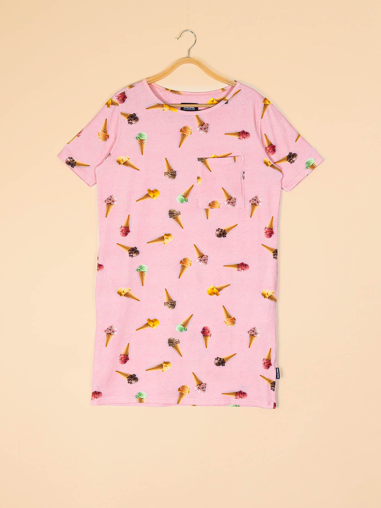 Heb jij ook nog plek over voor een ijsje? Maar liefst 5 heerlijke Italiaanse bollen ijs stapelden we op een hoorntje op je shirt. Op ware grootte, zo kan je ‘m al bijna vasthouden en proeven! Voor de broeken en jurkjes kozen we voor een vrolijke rondvliegend ijshoorntjes patroon op een warme roze achtergrond. Smelt jij ook?