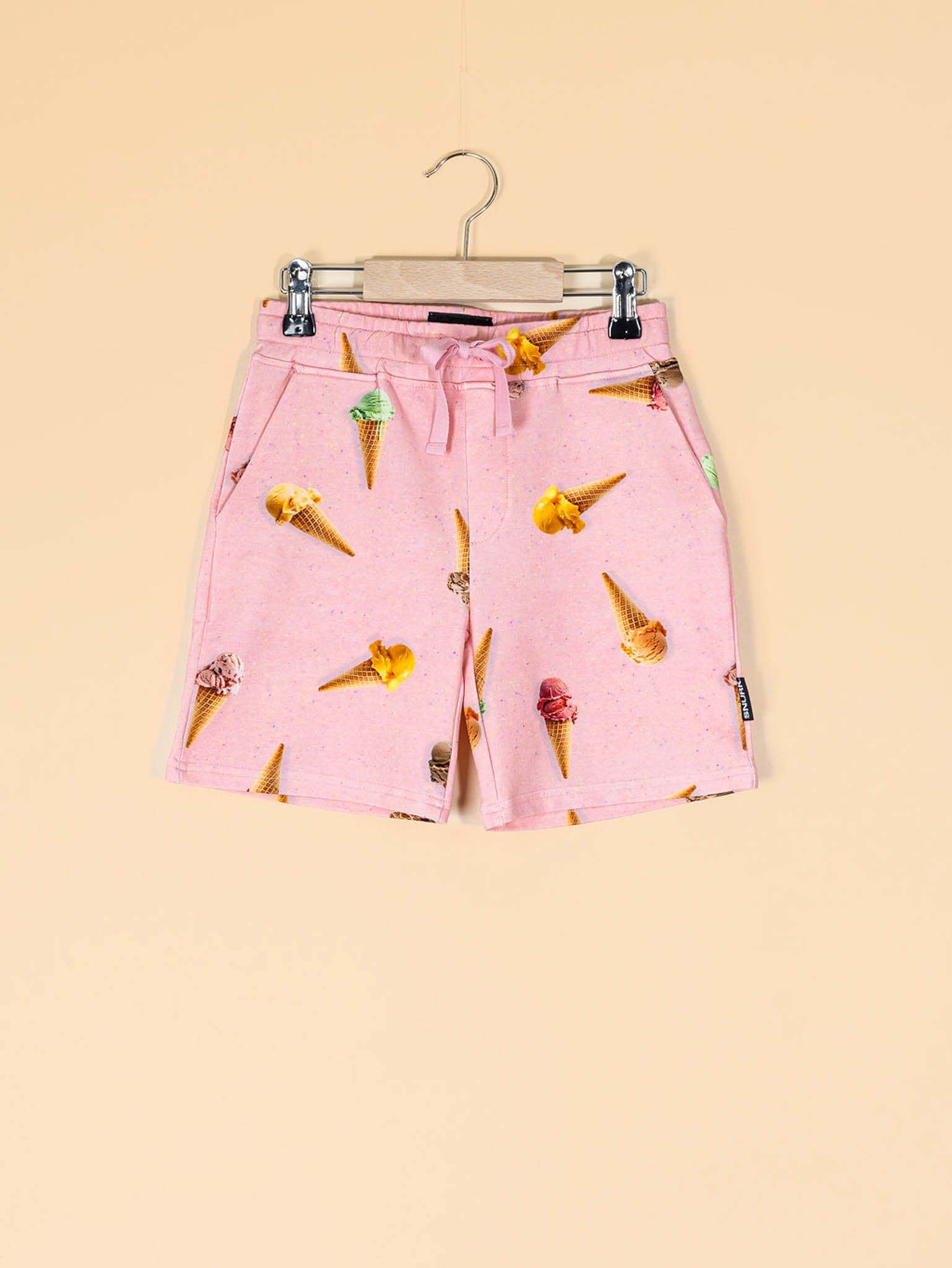 Heb jij ook nog plek over voor een ijsje? Maar liefst 5 heerlijke Italiaanse bollen ijs stapelden we op een hoorntje op je shirt. Op ware grootte, zo kan je ‘m al bijna vasthouden en proeven! Voor de broeken en jurkjes kozen we voor een vrolijke rondvliegend ijshoorntjes patroon op een warme roze achtergrond. Smelt jij ook?