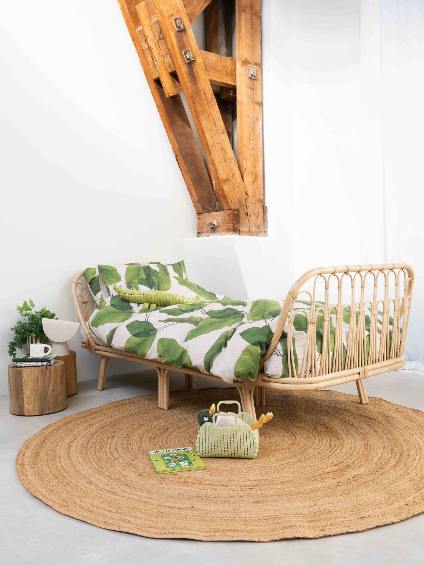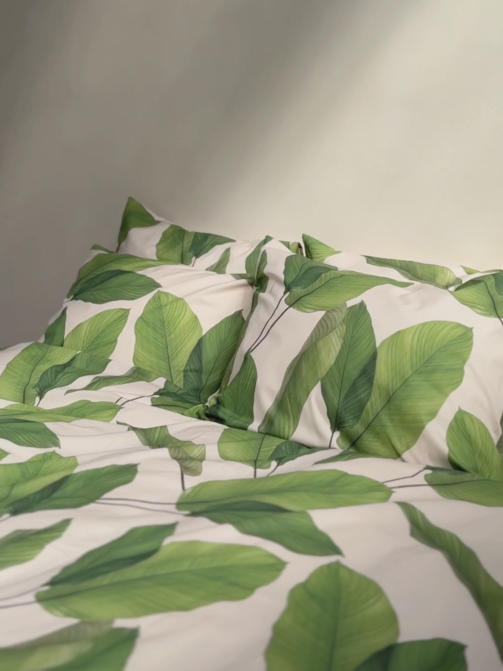 Grote groene bladeren waaieren over een beige achtergrond. Rustgevend, natuurlijk en toch uitgesproken. Gemaakt van zacht biologisch katoen, ademend en tijdloos mooi. Leaf me in bed. Liefst zo lang mogelijk.