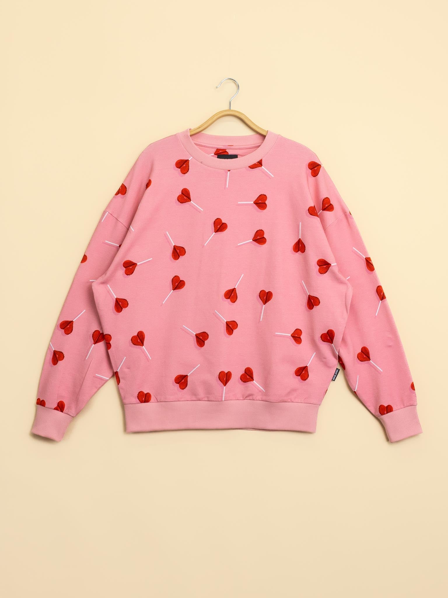 Alle gekheid op een stokje, deze print van fel rode hartjes lollies op roze achtergrond zijn toch te gezellig? Zoet, vrolijk en bomvol good-vibes. Gemaakt van zacht biologisch katoen. Of je nu heel klein bent of groot, hier gaat elk hartje sneller van kloppen.