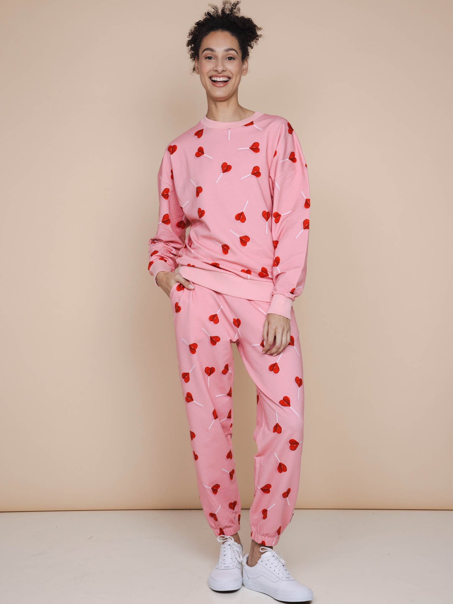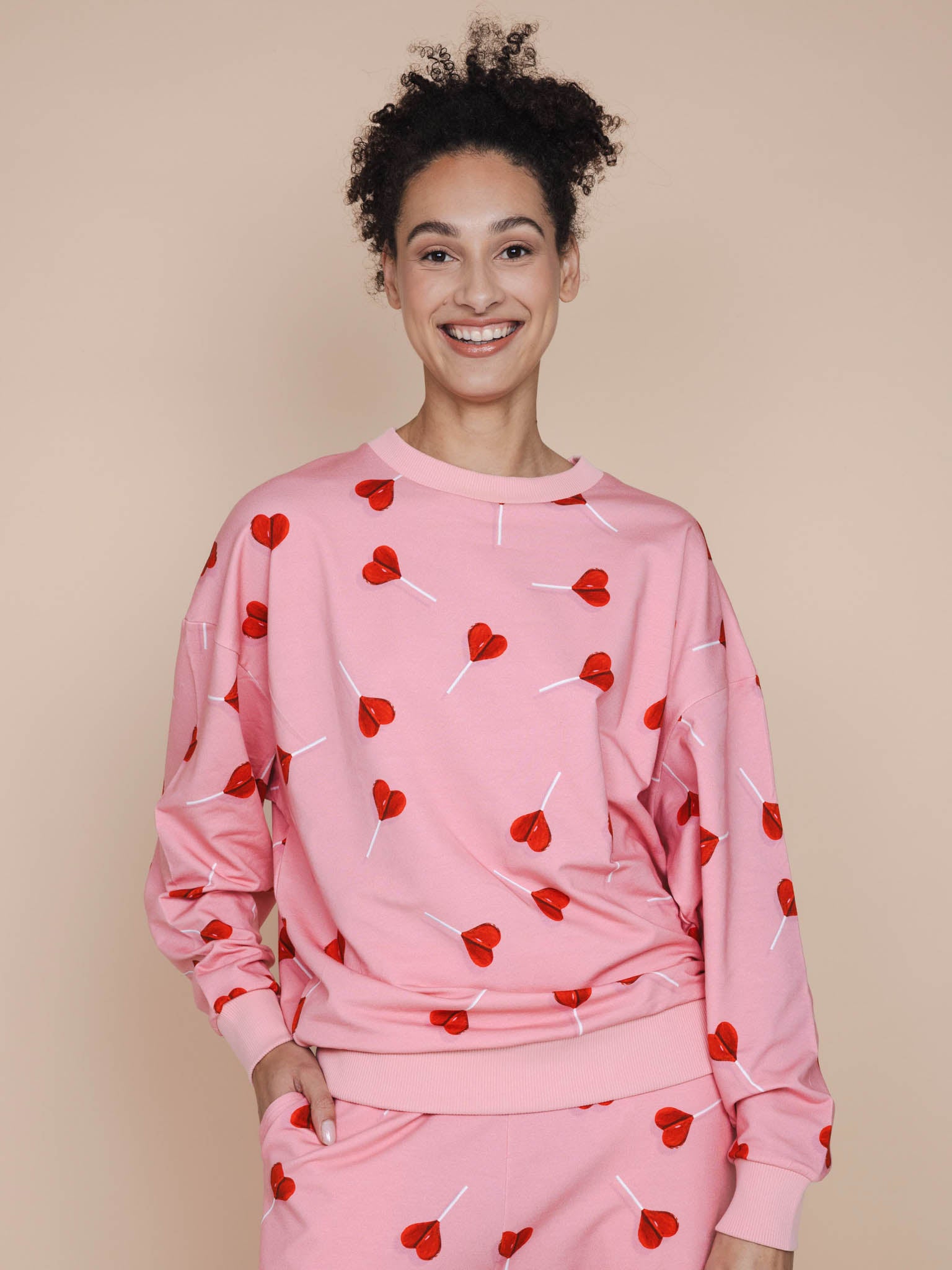Alle gekheid op een stokje, deze print van fel rode hartjes lollies op roze achtergrond zijn toch te gezellig? Zoet, vrolijk en bomvol good-vibes. Gemaakt van zacht biologisch katoen. Of je nu heel klein bent of groot, hier gaat elk hartje sneller van kloppen.