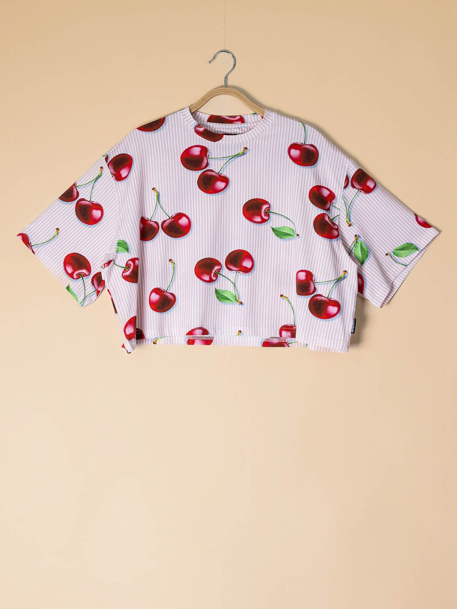 Zoet, vrolijk en rijp voor ontspanning.Met onze grote rode kersen print op roze streepjes haal je instant zomervibes in huis. De print is juicy, het katoen biologisch en superzacht. In deze SNURK pluk je elke dag.