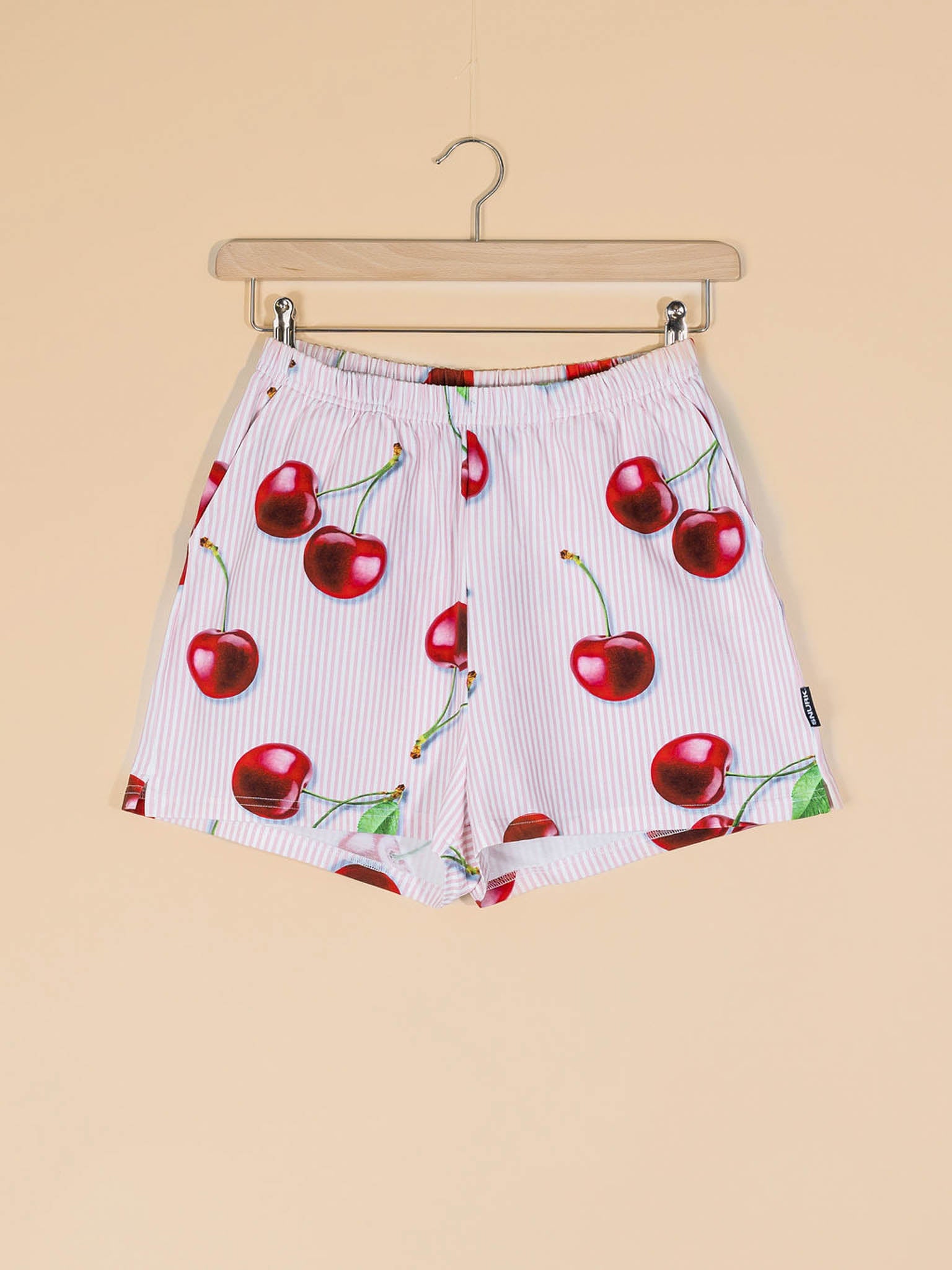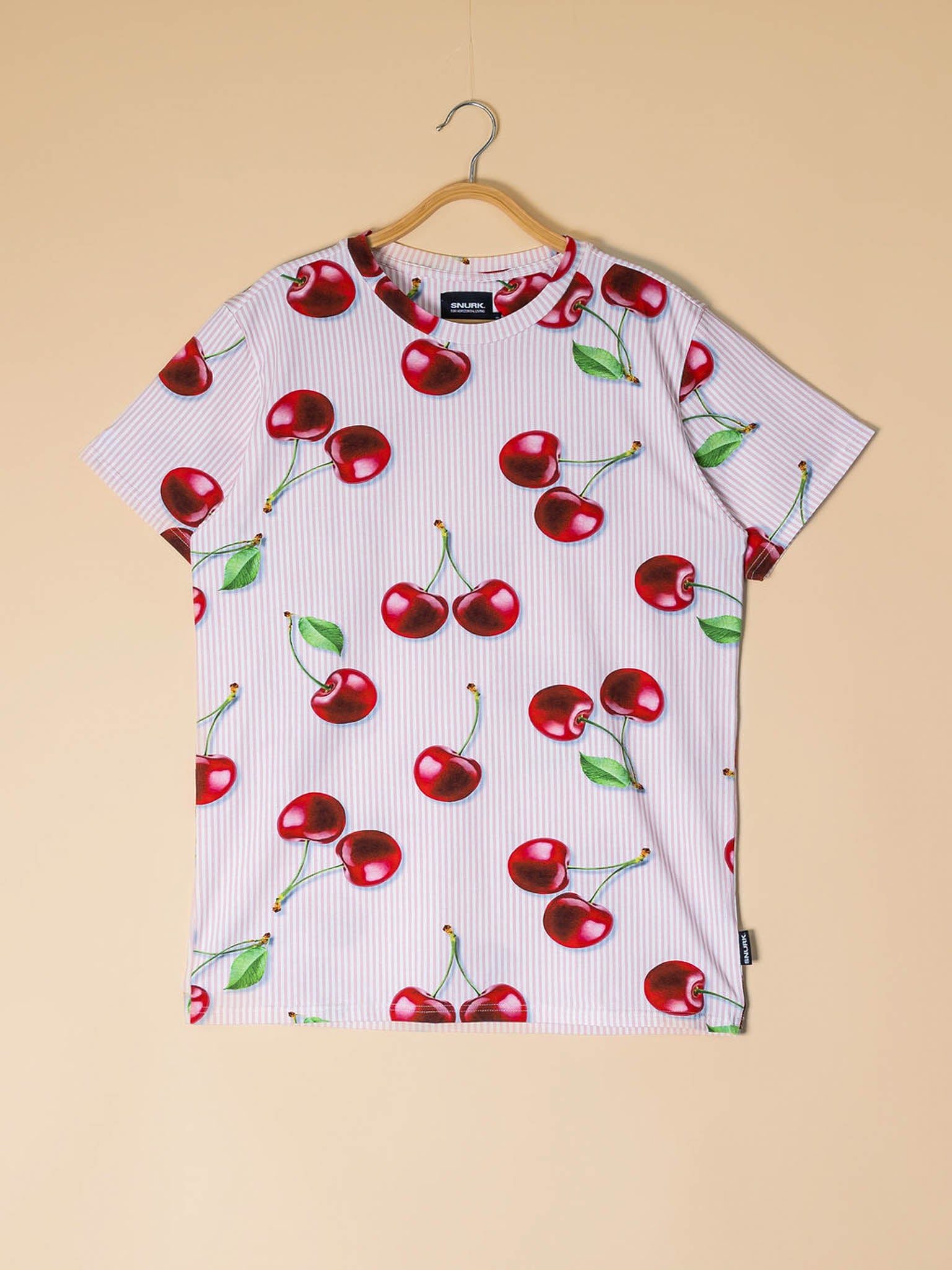 Zoet, vrolijk en rijp voor ontspanning.Met onze grote rode kersen print op roze streepjes haal je instant zomervibes in huis. De print is juicy, het katoen biologisch en superzacht. In deze SNURK pluk je elke dag.