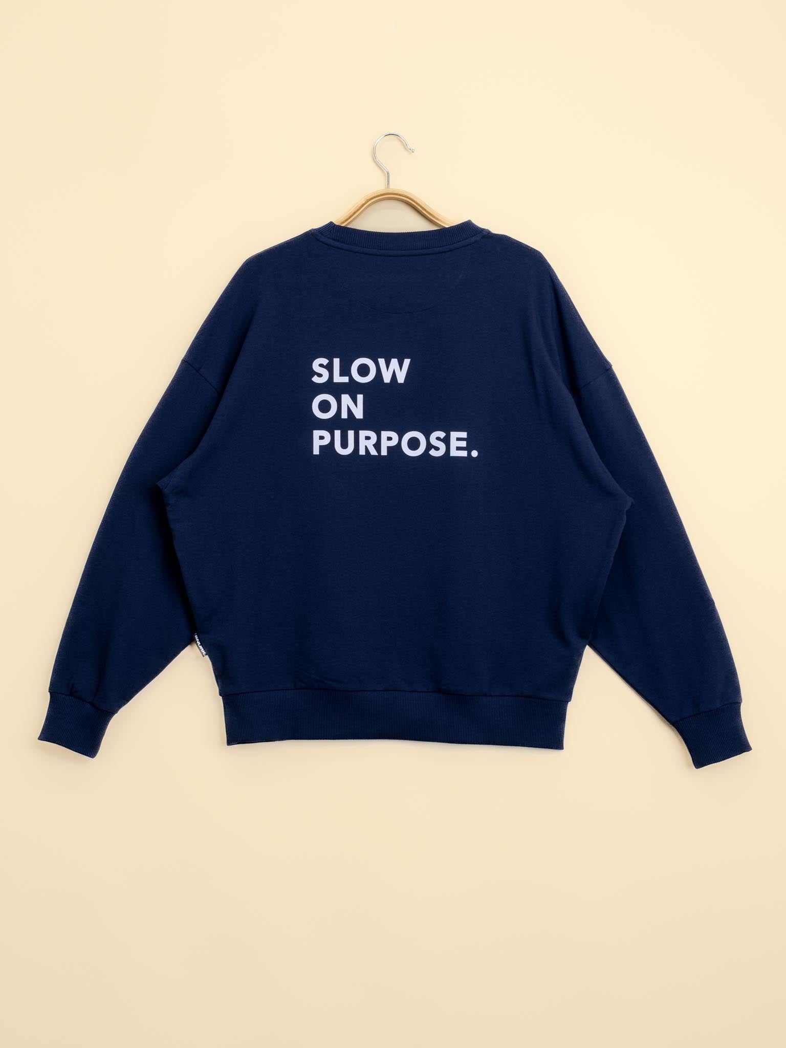 Niets zo luxe als je eigen tempo kunnen kiezen. In een wereld die altijd sneller lijkt te moeten, is dit een bewuste vertraging. ‘Slow on Purpose’ groot op je rug, als reminder voor jezelf en iedereen die achter je aan rent. Gemaakt van zacht biologisch katoen en ontworpen om comfortabel te vertragen. Verkrijgbaar in navy blauw, rood of lichtgrijs.