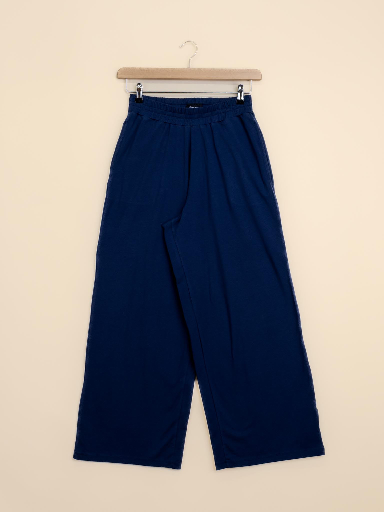 Zachte stretch jersey katoenen broek met wijde pijpen, diepe zakken en elastische tailleband